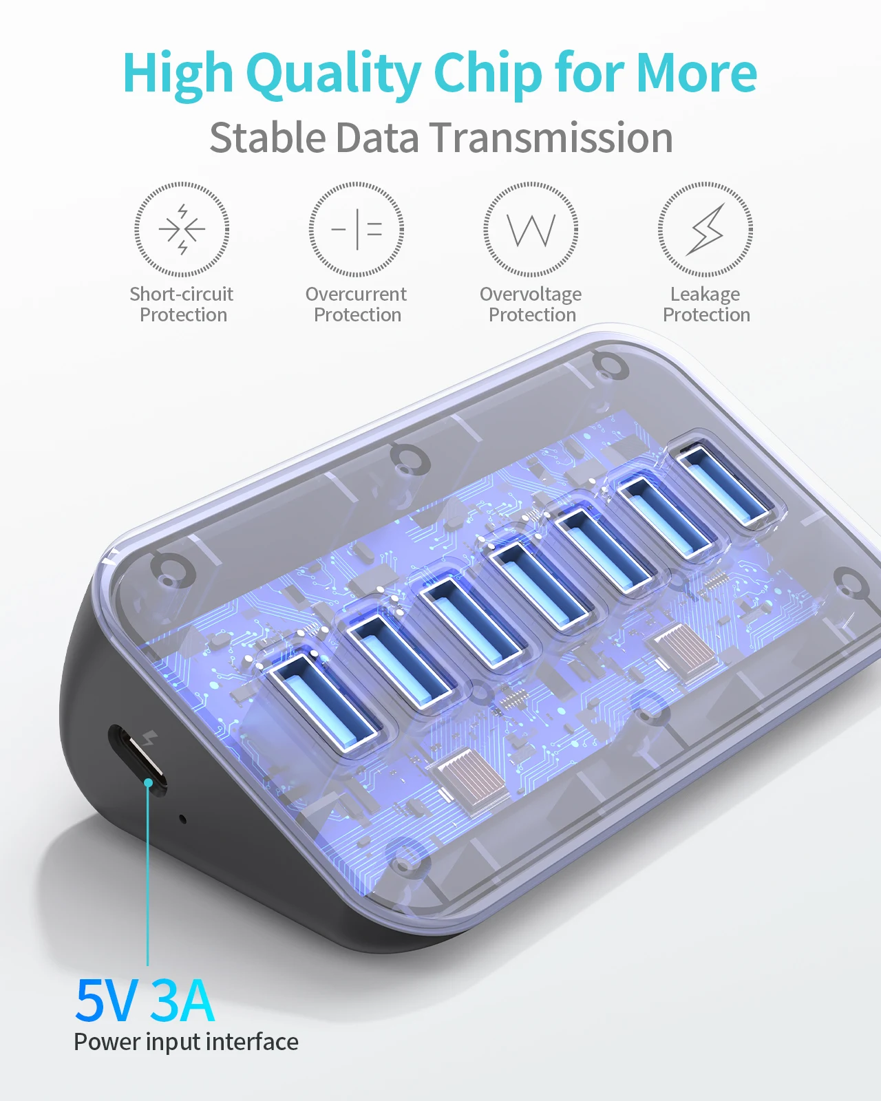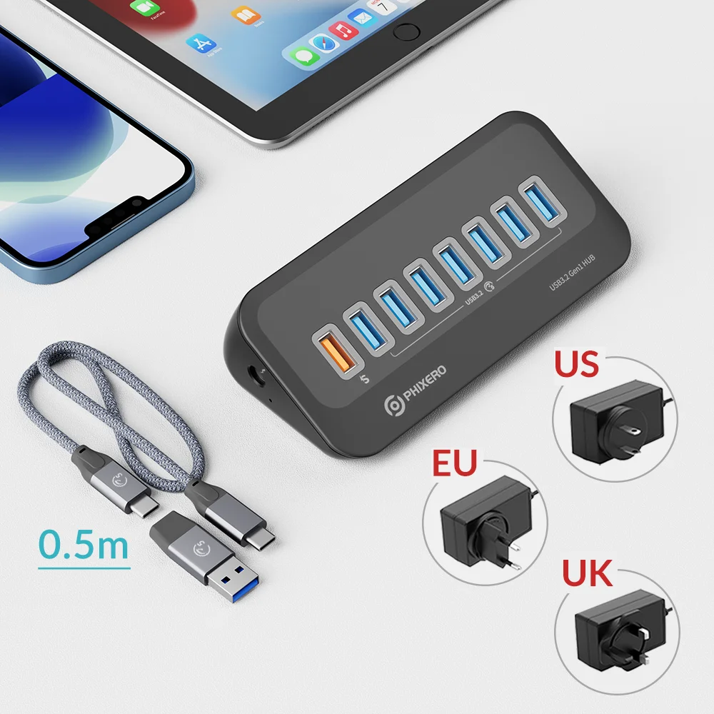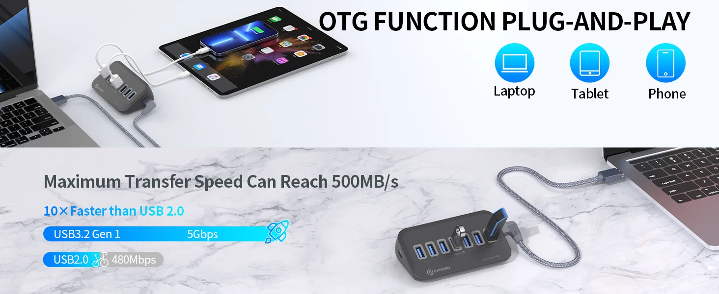 【USB 3.2 Gen 1】- El divisor USB de 7 puertos admite una transferencia de datos súper rápida de hasta 5 Gbps, 10 veces más rápida que el USB 2.0, lo que le permite transferir películas HD o archivos grandes en segundos.