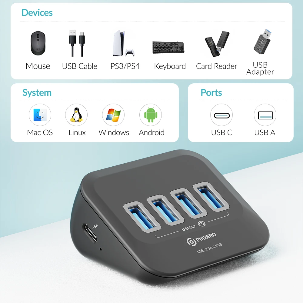 PHIXERO USB 3.2 Estación de acoplamiento Hub Adaptador divisor tipo C Múltiples puertos Varios enchufes OTG 3.0 con lector de tarjetas SD para PC portátil