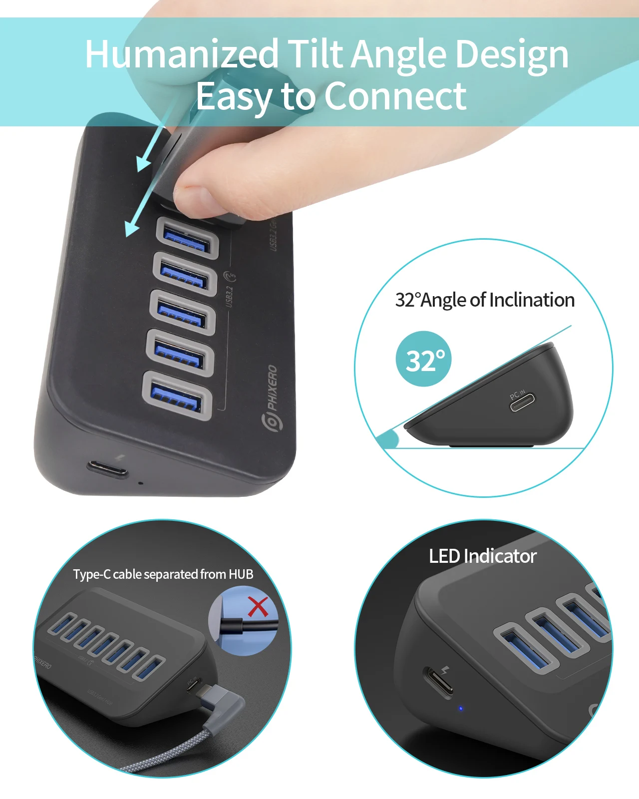 【Elegante y fácil de usar】- El diseño ergonómico en ángulo le permite conectar y desconectar fácilmente dispositivos USB.El diseño del cable de entrada reemplazable y sin cables le permite ajustar mejor la longitud del cable y prolongar la vida útil.