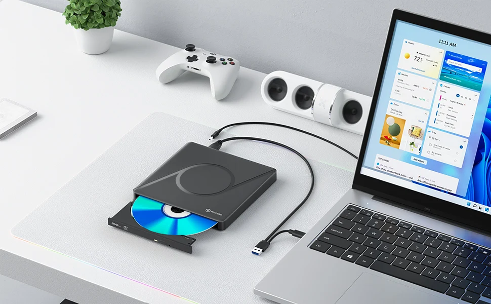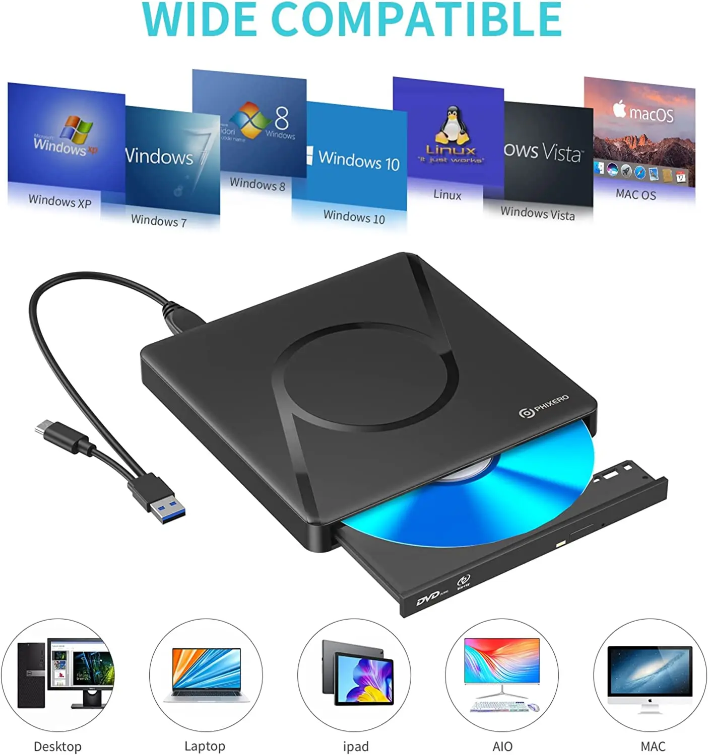 【Plug and Play y fácil de usar】La grabadora de DVD Blu-ray externa PHIXERO es fácil de usar, no es necesario instalar el controlador del programa.Simplemente conecte la unidad de DVD Blu-Ray externa al puerto USB para detectar el controlador de DVD y la operación es fácil, solo necesita arrastrar el archivo al ícono de grabación para comenzar a grabar.