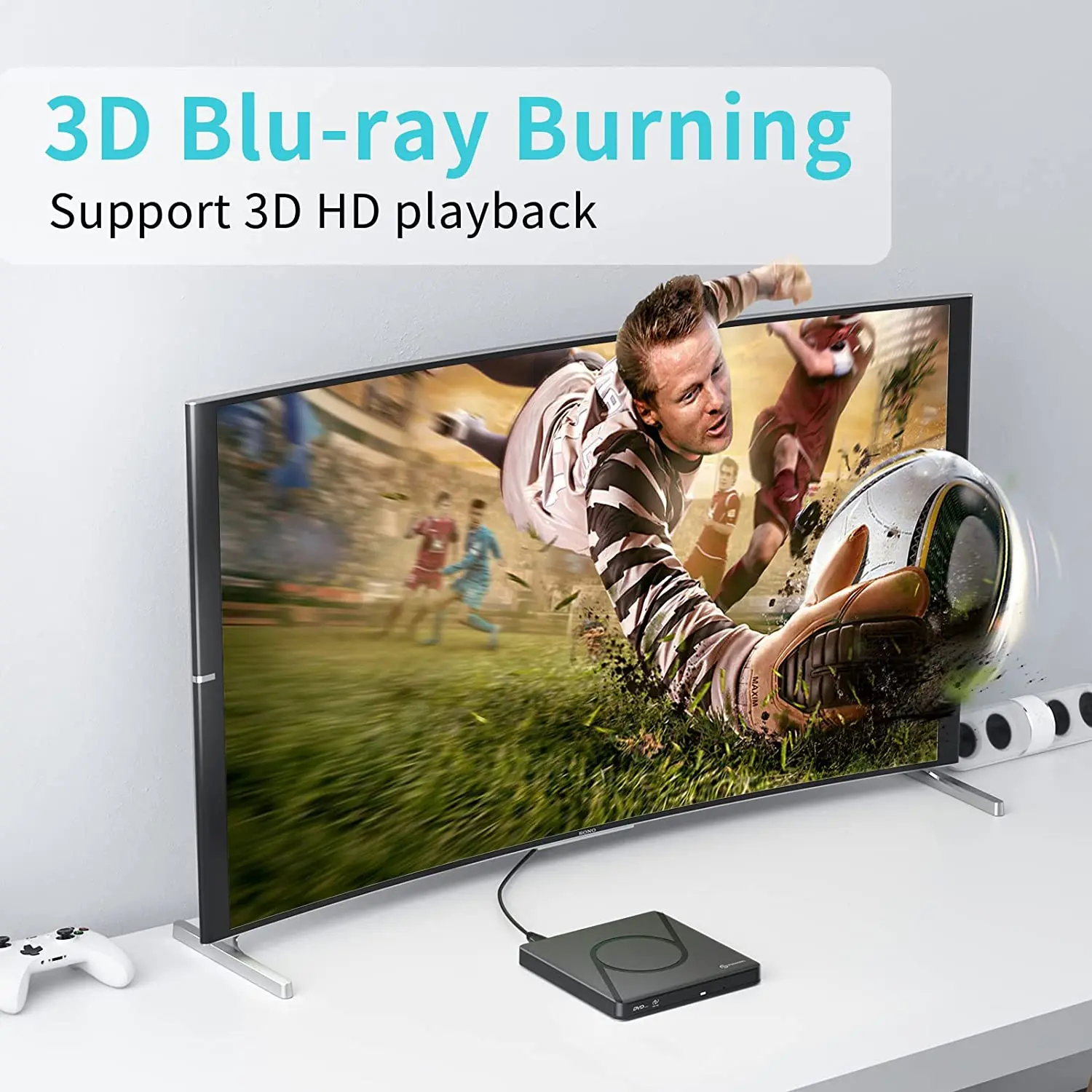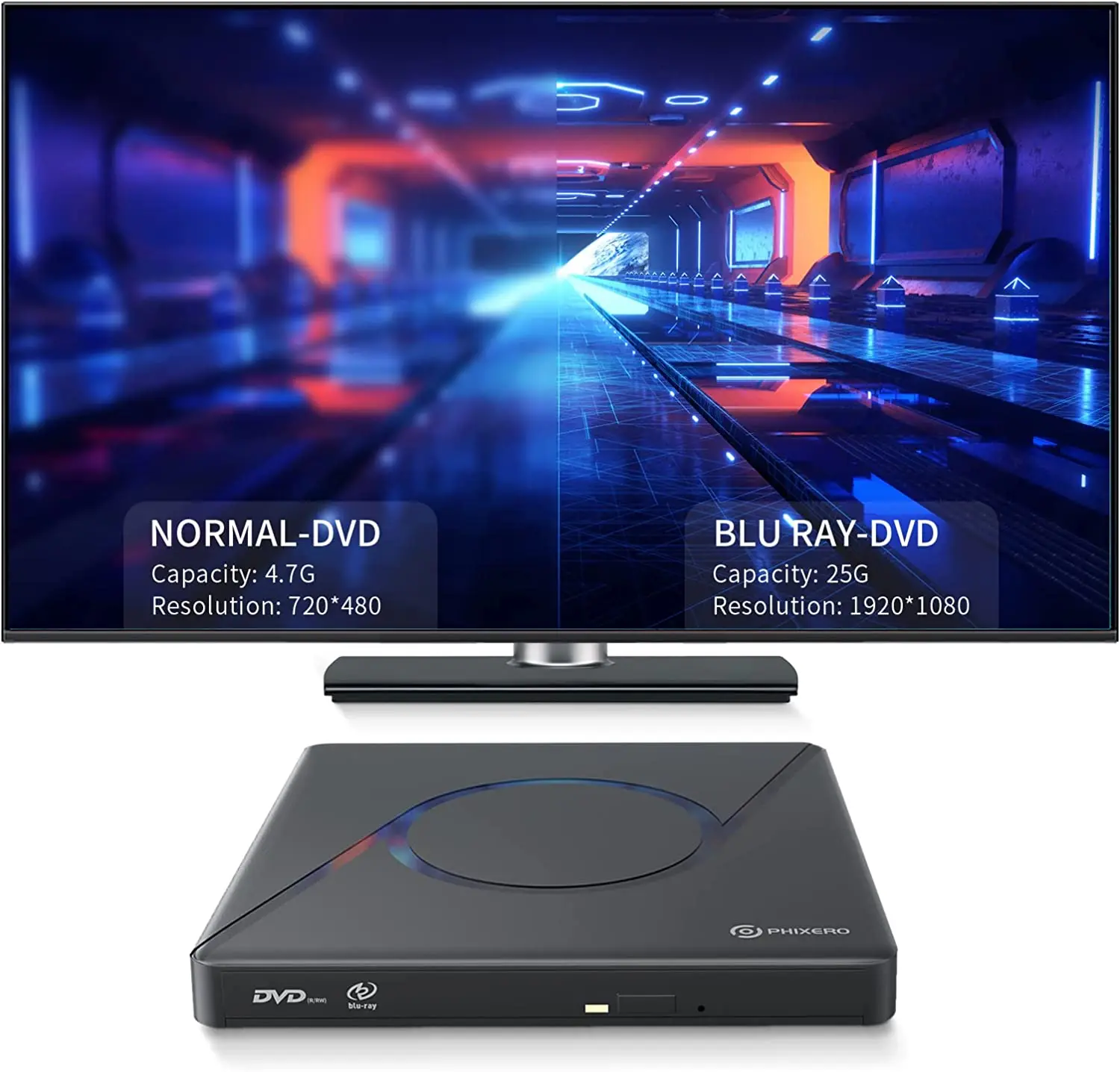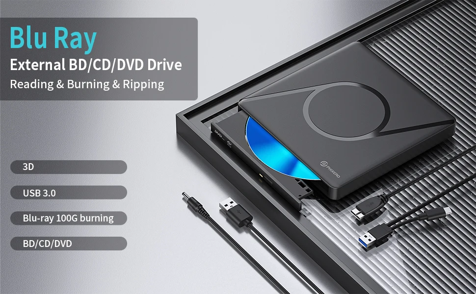 【Unidad de DVD Blu-ray externa USB 3.0】La grabadora Blu-ray USB PHIXERO adopta tecnología de grabación de alta calidad, admite 6X BD-ROM, 8X DVD-R, 8X DVD+R, 6X DVD-RW, 6X DVD+RW, 16X CD-RW, 24X CD-ROM, con USB 3.0 interfaz de salida, compatible con versiones anteriores de USB 2.0, brinda una velocidad de transferencia de datos estable de hasta 5G, reproduce música y películas sin retrasos ni distorsiones.