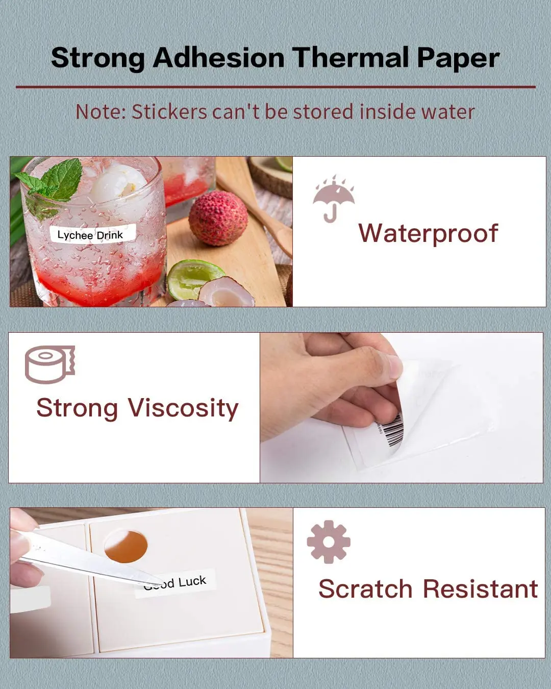 Características de la etiqueta térmica- Las etiquetas multiusos autoadhesivas Phomemo son resistentes al agua, al aceite, a la abrasión, tienen una fuerte adherencia y no contienen BPA.