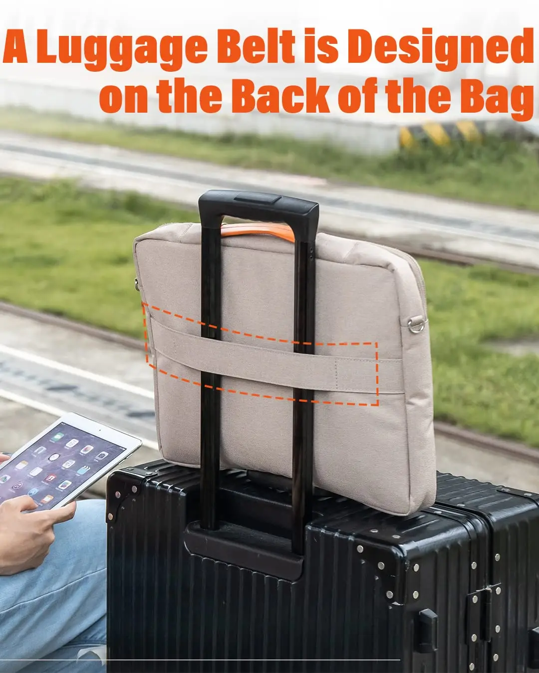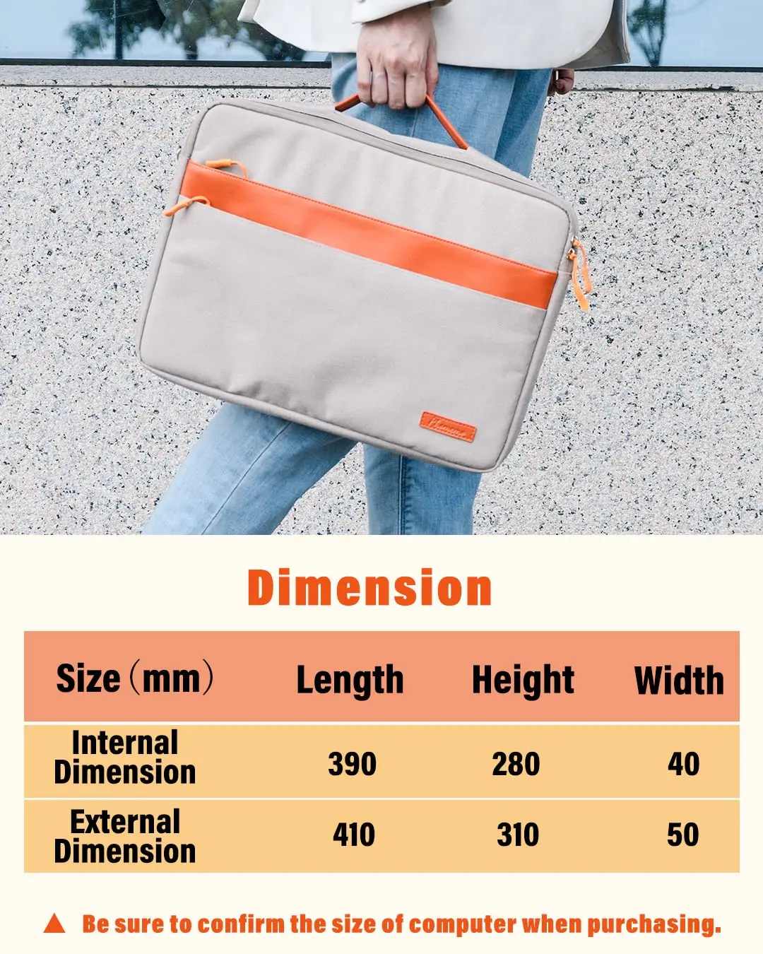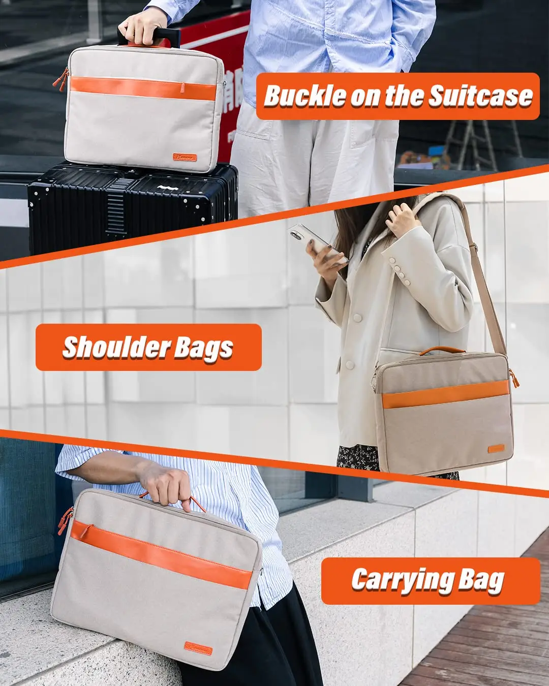 A la moda y ampliamente utilizado: la funda del maletín para portátil está diseñada en colores naranja y beige contrastantes. La forma general está a la moda y es joven. La bolsa de transporte para ordenador no solo tiene una correa de hombro y un asa de transporte. Si tiene una maleta al viajar, también puede colocarla y tirar fácilmente con la correa de resorte en la parte posterior. Ya sea trabajo, viaje de negocios, viajes o clase, este joven y moderno bolso para portátil puede mostrar su singularidad y gusto en la prisa de la vida.