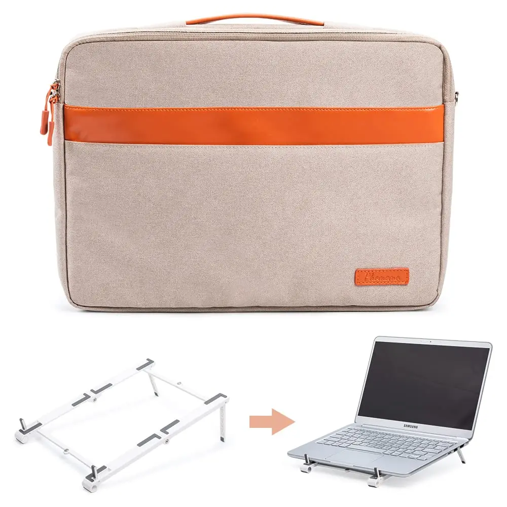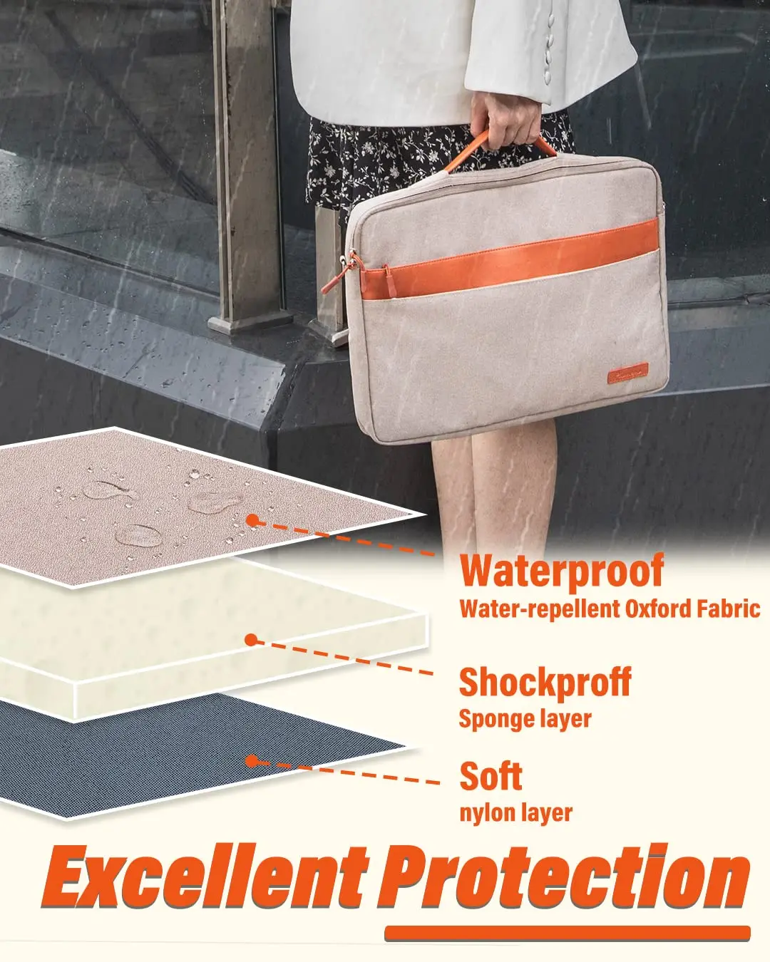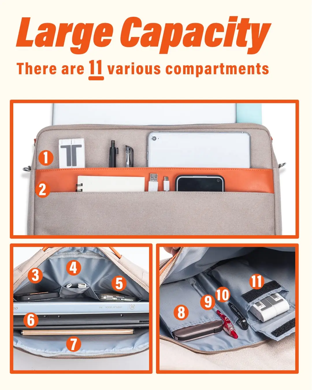 A la moda y ampliamente utilizado: la funda del maletín para portátil está diseñada en colores naranja y beige contrastantes. La forma general está a la moda y es joven. La bolsa de transporte para ordenador no solo tiene una correa de hombro y un asa de transporte. Si tiene una maleta al viajar, también puede colocarla y tirar fácilmente con la correa de resorte en la parte posterior. Ya sea trabajo, viaje de negocios, viajes o clase, este joven y moderno bolso para portátil puede mostrar su singularidad y gusto en la prisa de la vida.