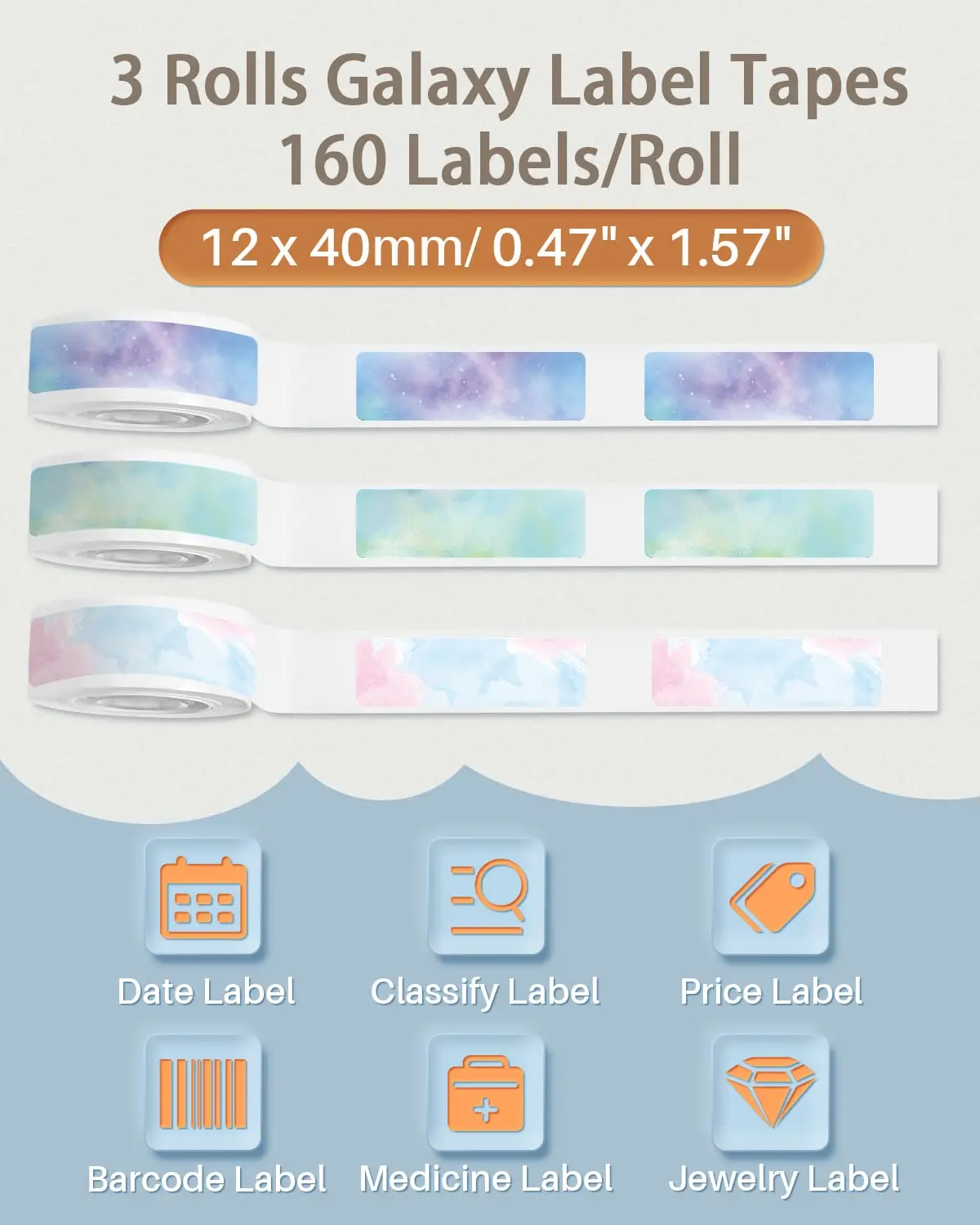 Contenido del paquete: 3 rollos de etiquetas de cielo estrellado de 12mm x 40mm/0,47 "x 1,57", 125 etiquetas por rollo. Caracteres negros en etiquetas rectangulares de colores.