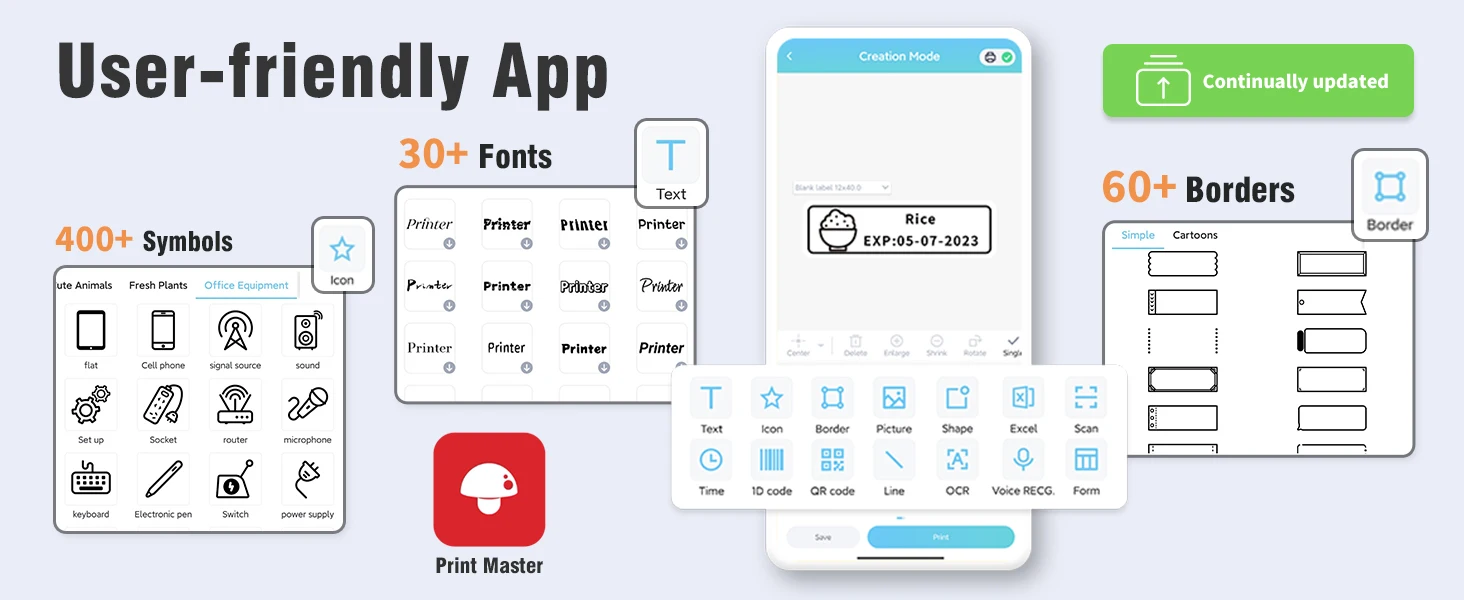 √ Fácil de usar: las aplicaciones Imprimir Master son potentes y fáciles de usar.Ofrece una variedad de fuentes, varios textos, códigos QR, códigos de barras, logotipos, símbolos e íconos.Es un regalo ideal para celebrar año nuevo, día de la madre, día del padre, vacaciones como presunto para niños, familiares y amigos.