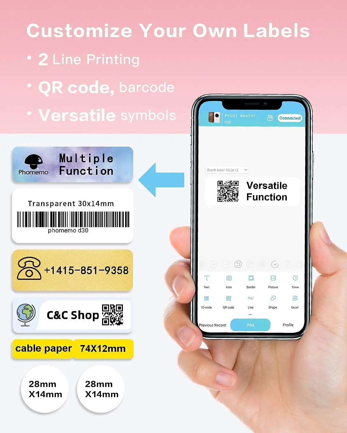 Estas mini rotuladoras llaman Phomemo d30, que utilizan tecnología de impresora térmica. En comparación con la impresora de etiquetas tradicional, esta es una mini rotuladora que no necesita presionar el mini teclado para editarla. Puedes disfrutar de la aplicación inteligente Print Master.
