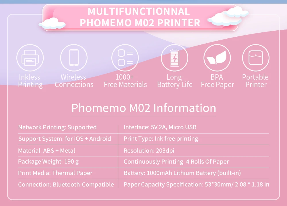 5. Battery: 1000mAh Lithium Battery (built-in), Can Continuously Printing 4 Rolls Of Paper