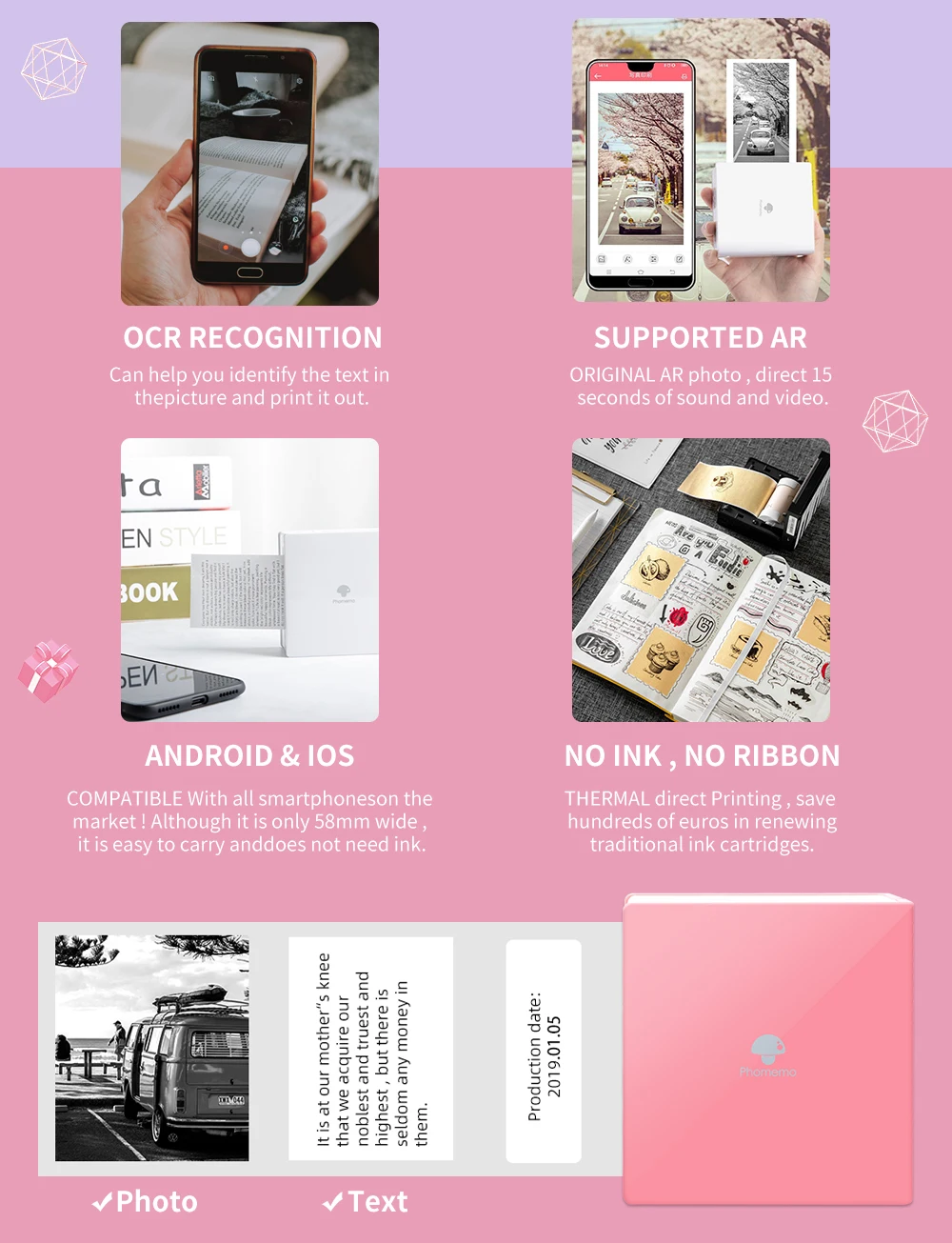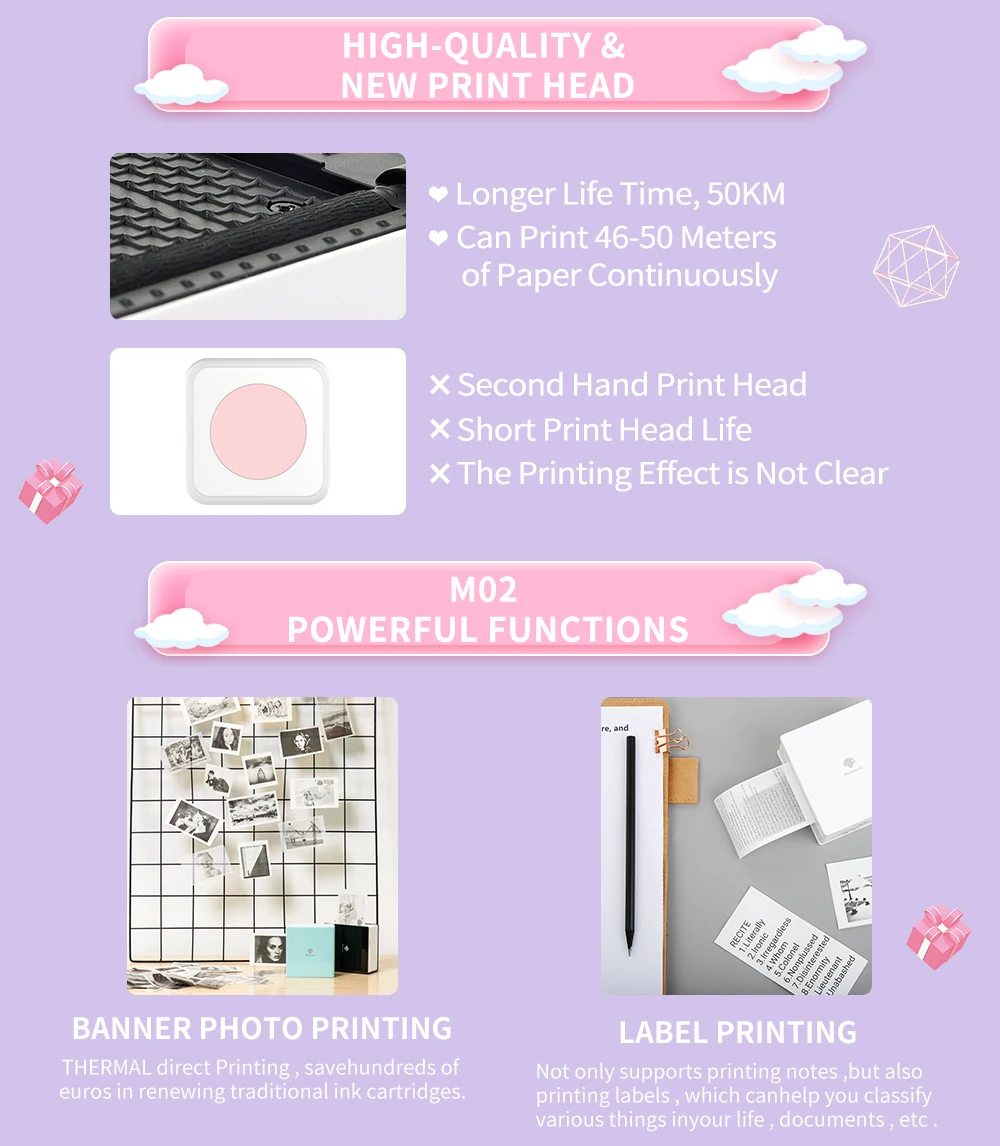 2.Phomemo Photo Label Printer Built-in 1000mAh battery that lets you take it anywhere, continuously working for 24 hours, 1.5 hours charging time and 1 week standby time.