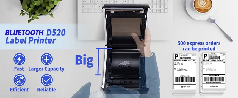 Impresora térmica rápida y fiable: Impresora de etiquetas térmicas D520 ultrarrápida a 150 mm/s. Impresión media de hasta 60 hojas de etiquetas de 4 "x 6" por minuto. La impresora sin tinta no requiere tinta ni cinta y no se ensuciará las manos.