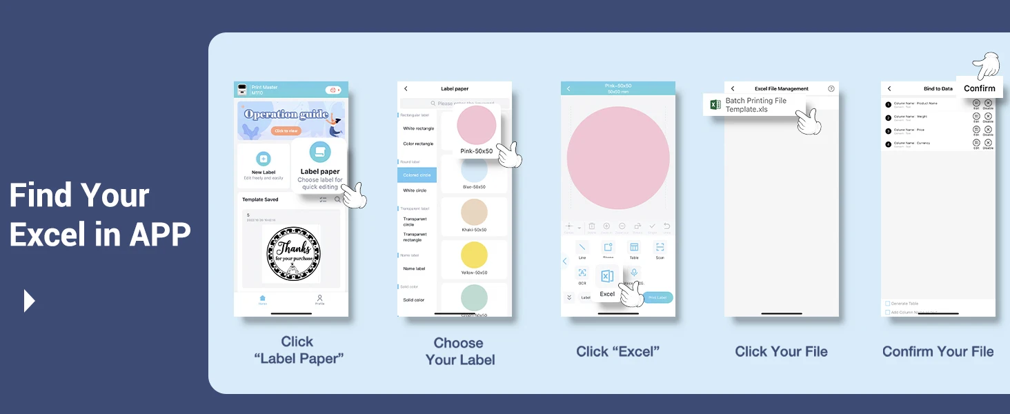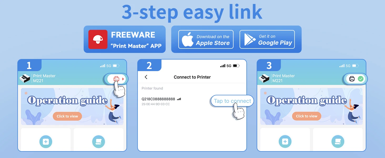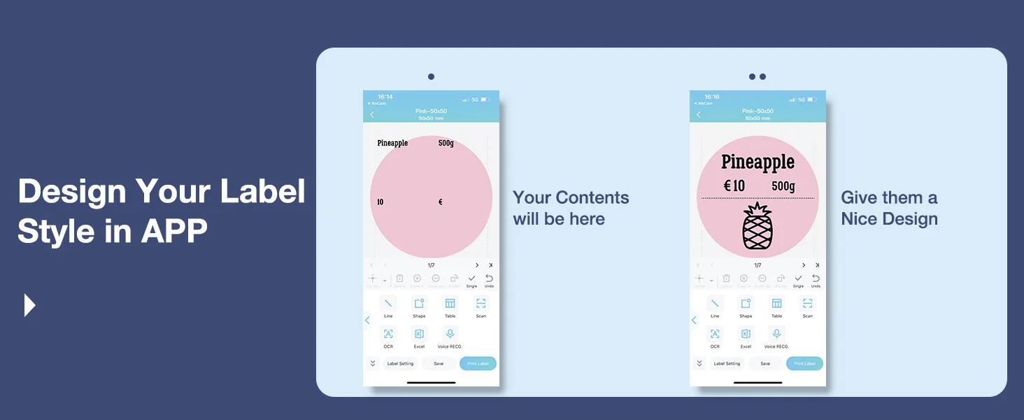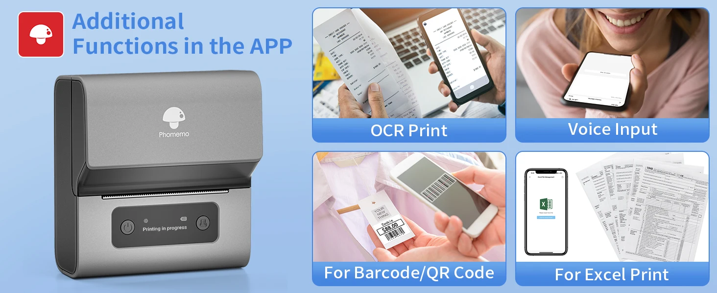Función de lectura y adición, importación de excel, grabación de voz o código, código 1D, icono, Formulario, impresión de imágenes, función de escaneo y creatividad personalizada. La aplicación gratuita puede obtenerla en apple store o google play.