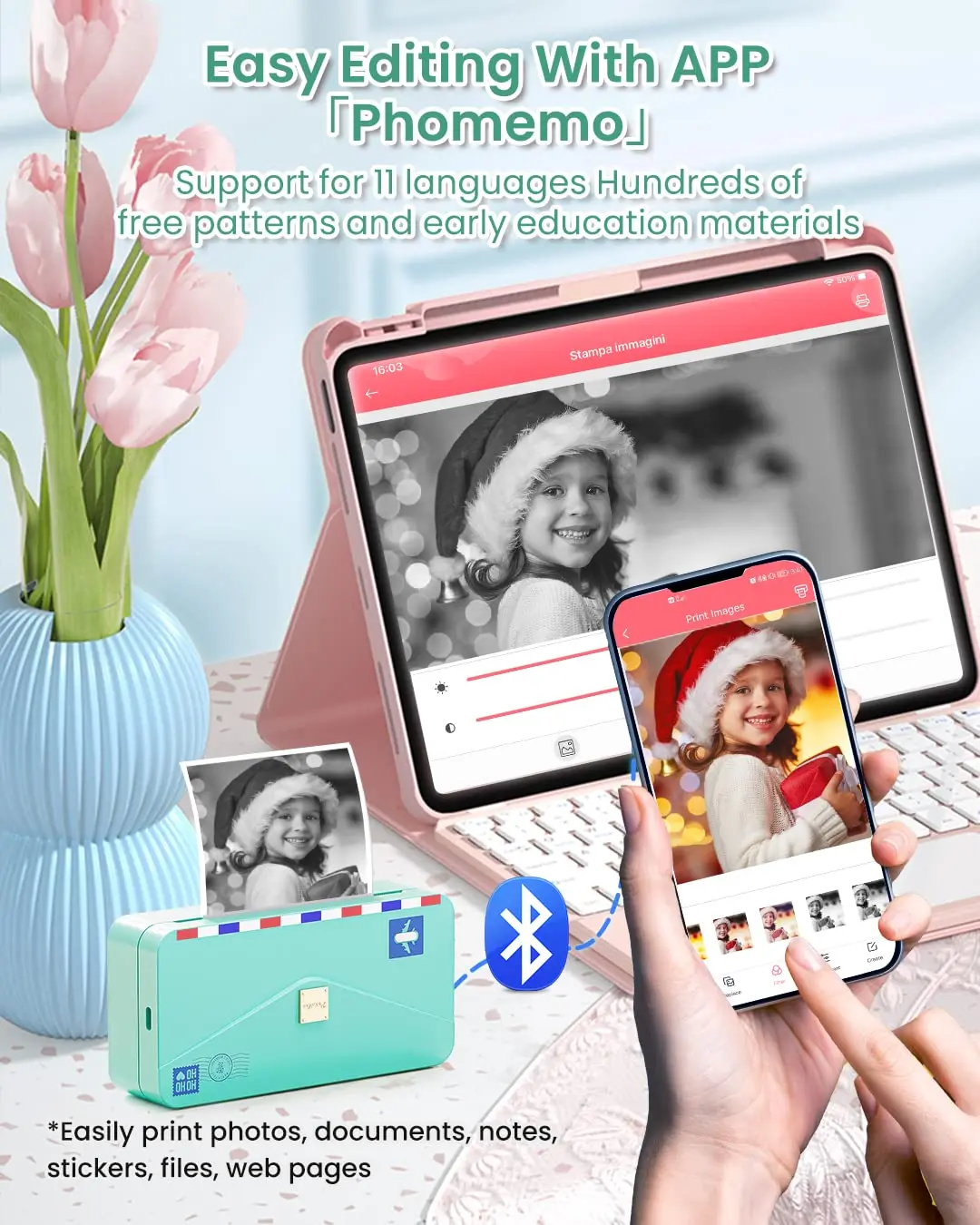 APP fácil e inteligente-La impresora portátil Phomemo M04AS es compatible con teléfonos móviles y tabletas, pero no con ordenadores. La aplicación incluye fotos, documentos, páginas web y funciones de escaneo e impresión OCR. También puede utilizar el taller de etiquetas para imprimir etiquetas. Cientos de bonitos materiales gratuitos están disponibles para su uso y se actualizan constantemente.