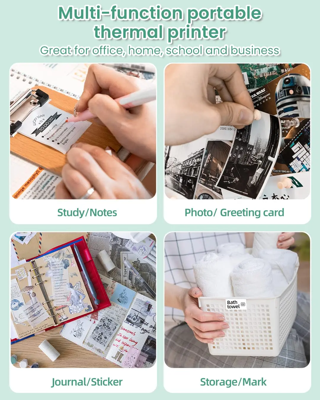 Mini impresora multifuncional-Phomemo M04AS es adecuado para el hogar/oficina/escuela/uso comercial. Puede imprimir listas, documentos y notas de estudio. También puede imprimir fotos o pegatinas en blanco y negro. Es mejor usar papel térmico transparente. También es un gran regalo para Navidad/Acción de Gracias/elección de regalo de cumpleaños.