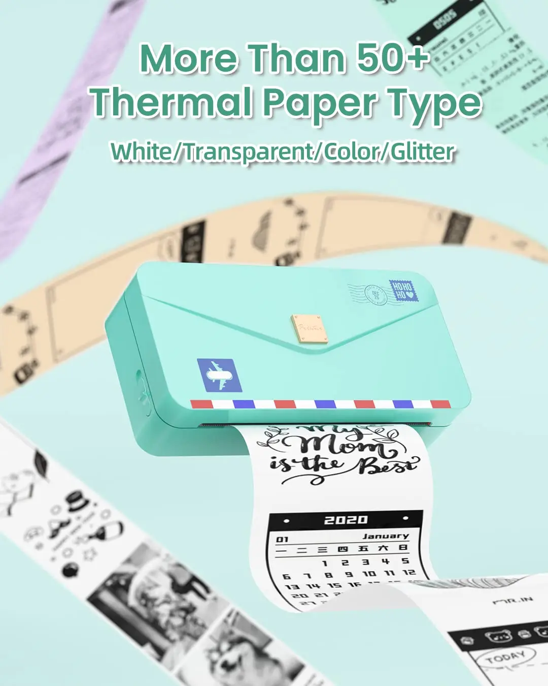 Varios estilos de papel-Compatible con más de 50 papeles diferentes. Papel térmico Blanco/color/transparente/semitransparente/brillante. También puede elegir entre Pegatina o sin pegatina. Elija libremente el estilo que desee.
