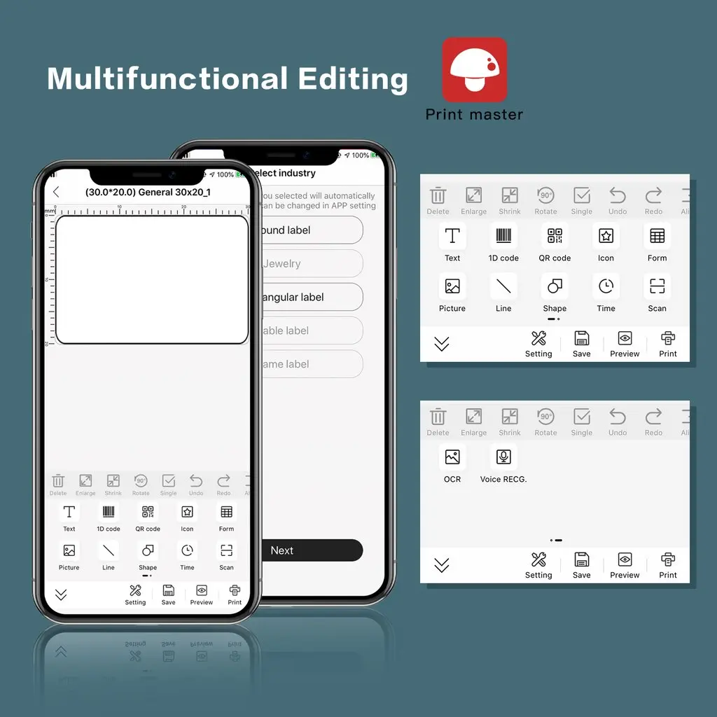 Impresora de etiquetas Bluetooth con varias plantillas de aplicaciones, edición de teléfonos móviles, puede elegir la plantilla de acuerdo con sus necesidades y puede configurar la nueva plantilla de tamaño.