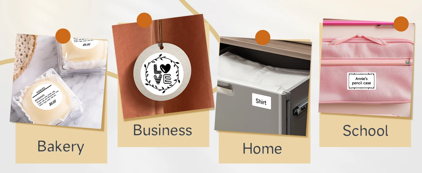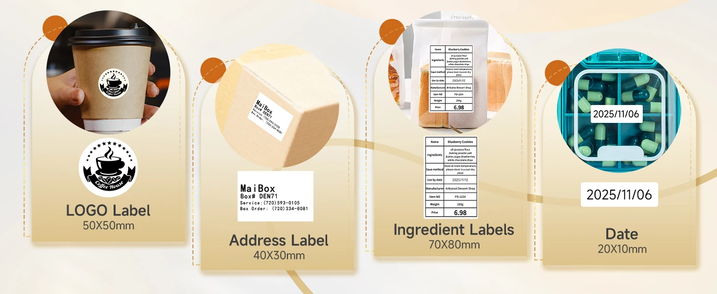 ¡Imprima etiquetas para frascos, botellas, cajas de almacenamiento, contenedores de alimentos, información del producto, direcciones de envío y más!Admite códigos de barras, códigos QR, texto e imágenes.