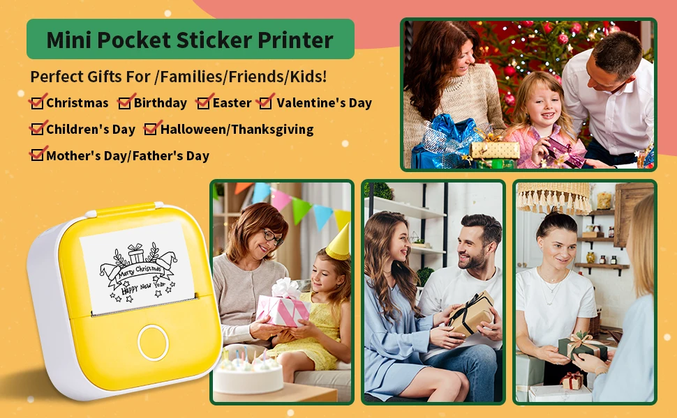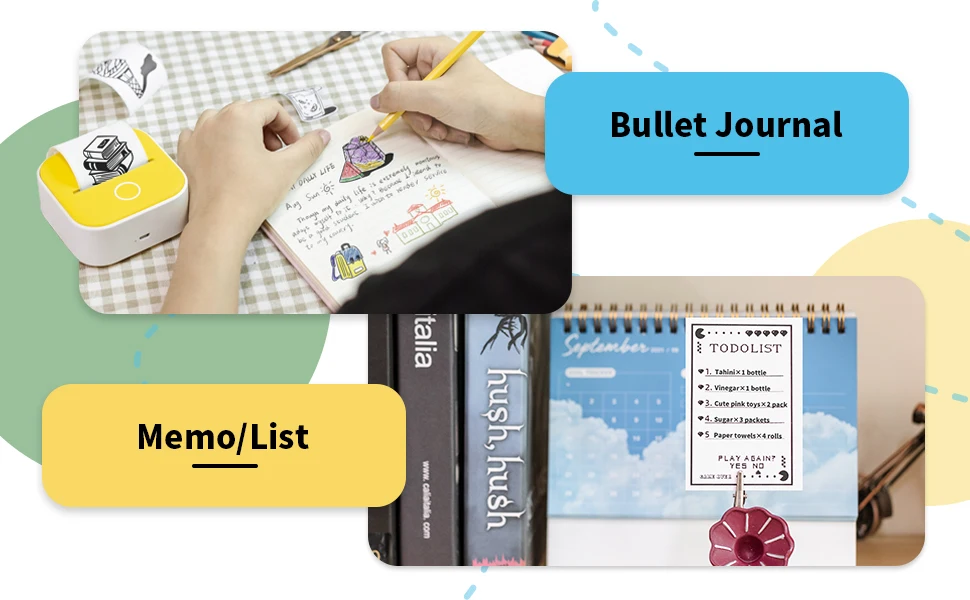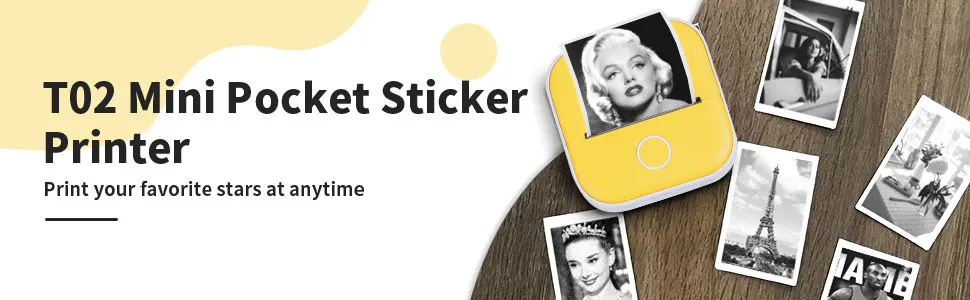 La mini impresora de bolsillo Phomemo T02 Bluetooth funciona con papeles térmicos pegajosos y no pegajosos con impresiones en negro en papel blanco/color puro/patrones e impresiones en azul en papel blanco especial.