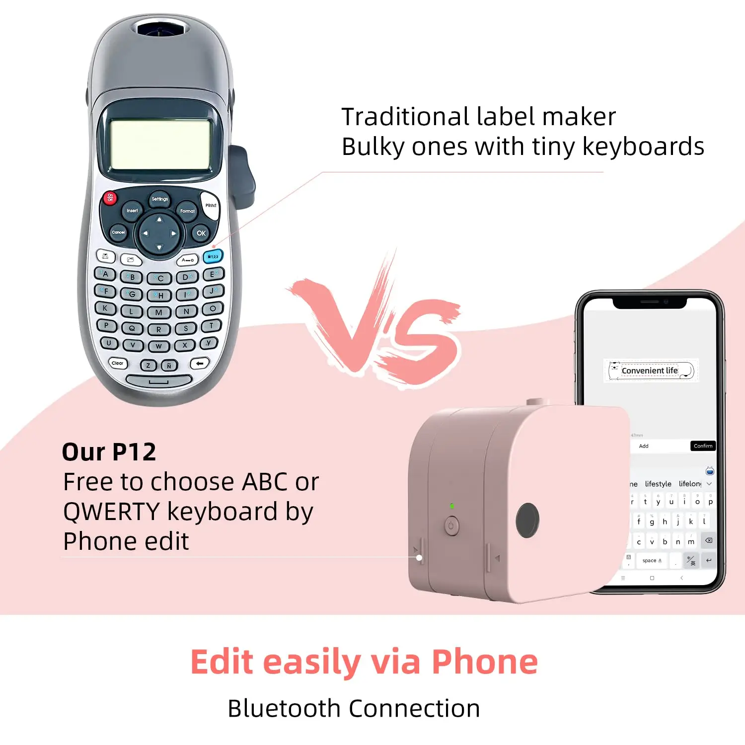 Etiquetadora Phomemo P12Es compatible con teléfonos iPhone y Andriod a través de Bluetooth. El tamaño portátil y la función de alimentación por batería hacen que sea fácil llevarlo a todas partes.