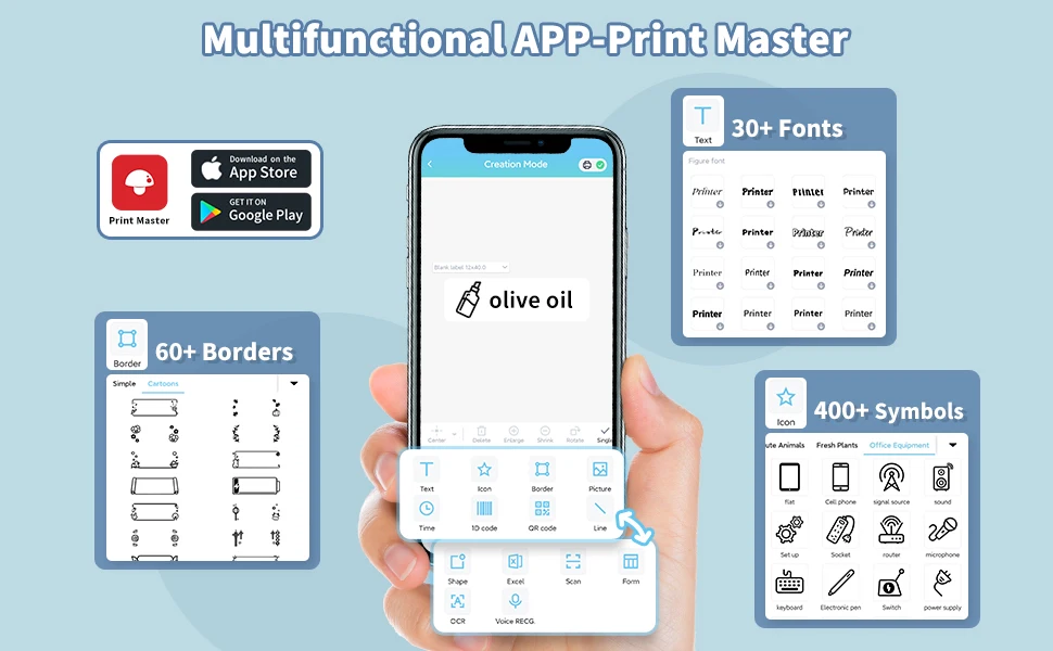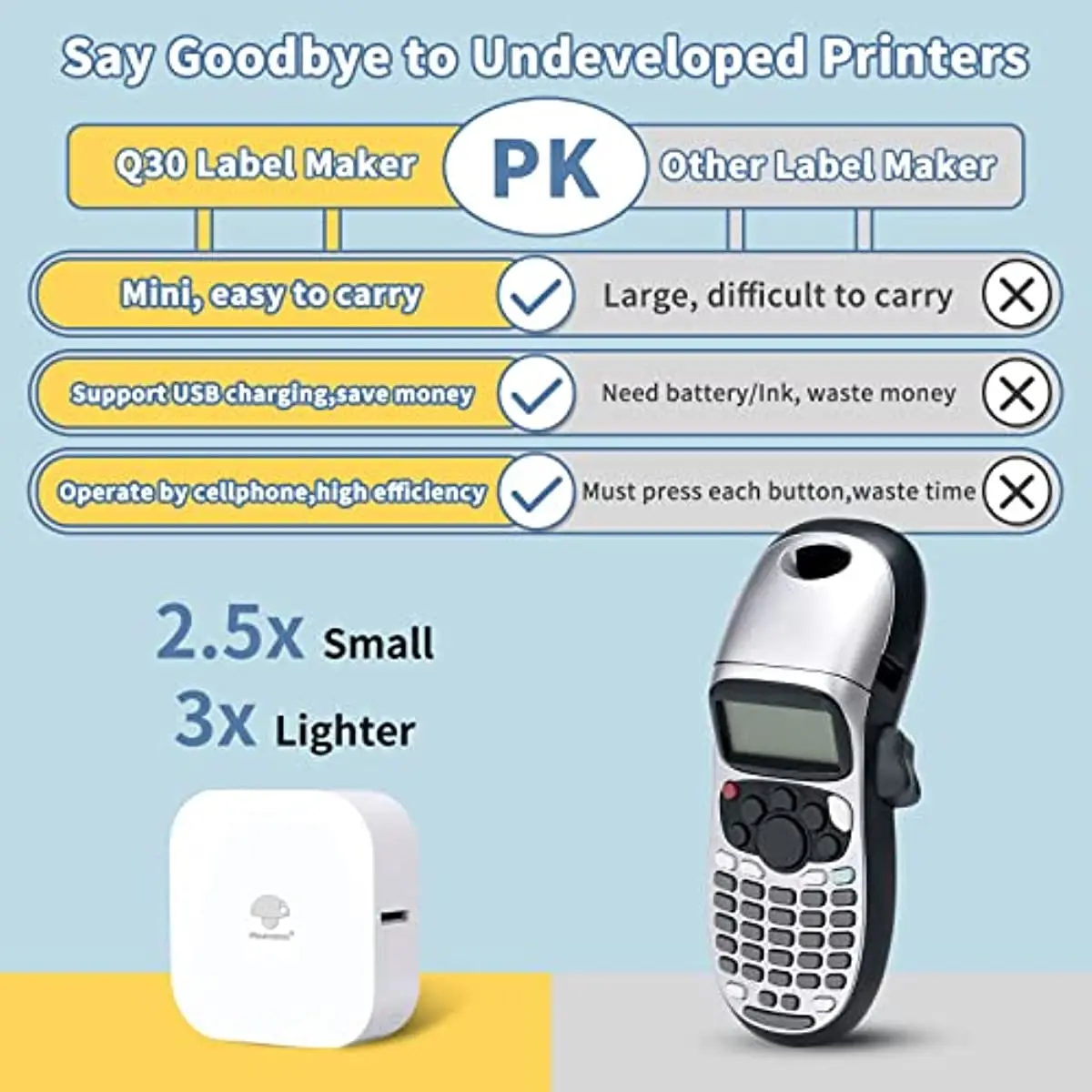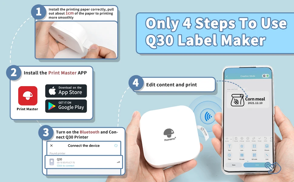 [Fácil de usar]- En comparación con la impresora de pegatinas portátil de teclado tradicional, nuestra máquina generadora de etiquetas con cinta adhesiva, no es necesario presionar cada botón.Esta rotuladora inalámbrica: 1Descargue la aplicación "Print Master" 2Encienda el bluetooth del teléfono 3 haciendo clic en el botón en la esquina hacia arriba derecha de la aplicación para conectar el dispositivo Q30.¡Empiece a imprimir!La aplicación incluye océanos de bibliotecas de materiales, fuentes, modos de edición de texto, etc. y admite idiomas multinacionales.(Vídeo guía del usuario en la aplicación: Perfil → Tutoriales).