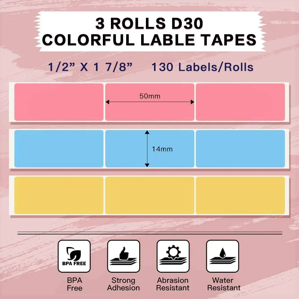 Lo que obtienes: 3 cintas de etiquetas de color en rollo. 1/2 "X 1 7/8" (14mm x 50mm) , 130 etiquetas por rollo. Texto en blanco y negro. EsResistente al agua, a la abrasión y libre de BPA¡!