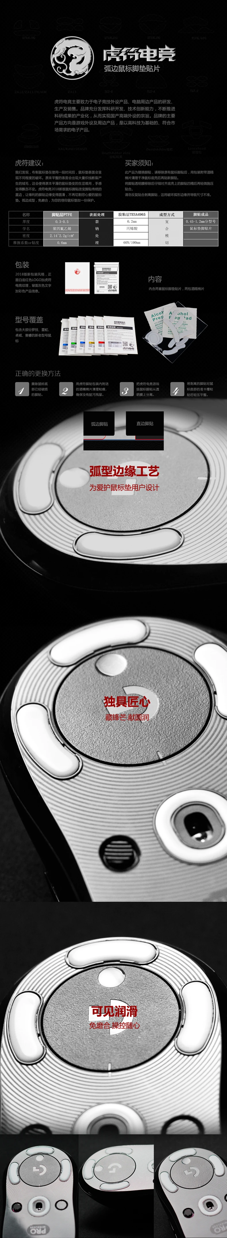 Encontramos que después de usar la alfombrilla de ratón de tela durante un período de tiempo, la superficie de la alfombrilla de ratón se dañará en diversos grados. La superficie plana original tendrá una gran cantidad de roturas de lana, lo que hará que la alfombrilla de ratón suave original se vuelva astringente y difícil de usar, y la sensación será errática. El nuevo pie de ratón Tiger para gaming 2018 cambia el tradicional pie de ratón de borde recto, haciendo que los bordes afilados del pie se suavicen y no corten tu alfombrilla de ratón favorita, con una forma de borde curvo que protege tu alfombrilla de ratón contra el desgaste.
