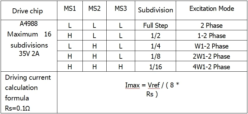 Seis resoluciones de pasos diferentes: paso completo, medio paso, 1/4 paso, 118 paso, 1/16 paso y 1/32 paso