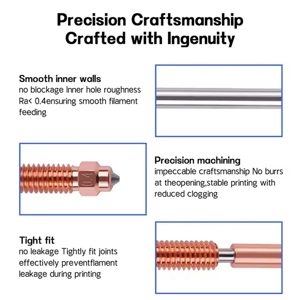 Artesanía de precisión: la pared interior es lisa y no tiene obstrucciones.La rugosidad del orificio interior es Ra 0,4 y la alimentación es suave.El mecanizado de precisión es impecable, el orificio no tiene rebabas y la impresión es estable y no es fácil de bloquear.Y las juntas que se ajustan perfectamente y evitan eficazmente fugas de filamento durante la impresión.