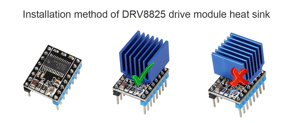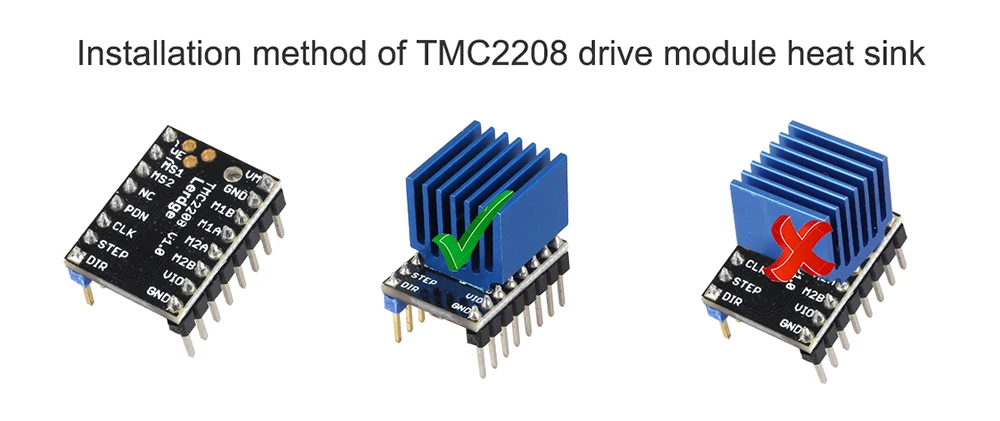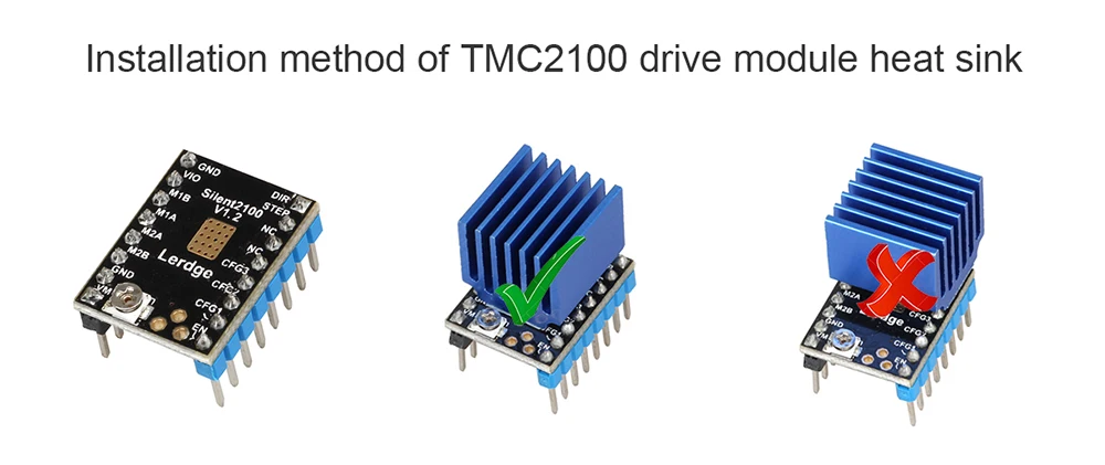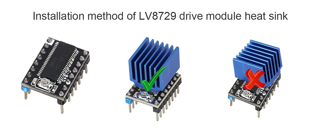Consejos:Este disipador de calor es adecuado para LV8729, TMC2100 y DRV8825. Debido a que el chip del controlador A4988 es demasiado pequeño, no se recomienda su uso en A4988. Si se maneja incorrectamente, es fácil tocar los pines.