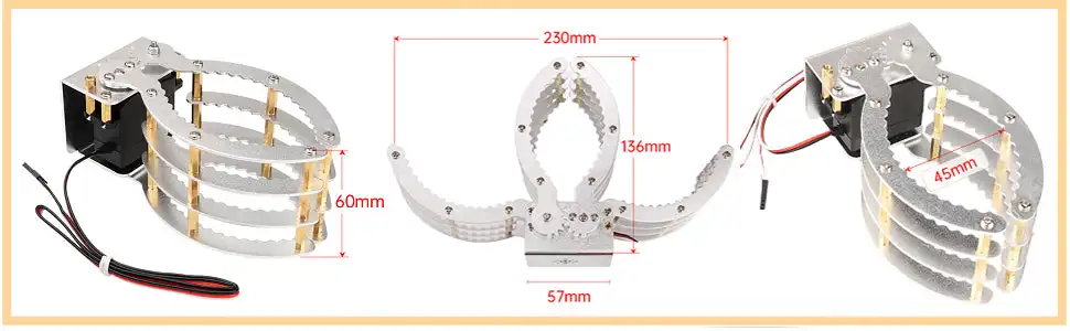 Descripción del producto Esta pinza de aleación de aluminio se puede utilizar con facilidad en sus proyectos de robots de bricolaje para convertir sus fantásticas ideas en realidad.Su distancia máxima de apertura alcanza los 230 mm, lo que permite agarrar artículos de diferentes tamaños.La pinza puede cerrarse herméticamente para que sus objetos salen y salvan sin caerse.