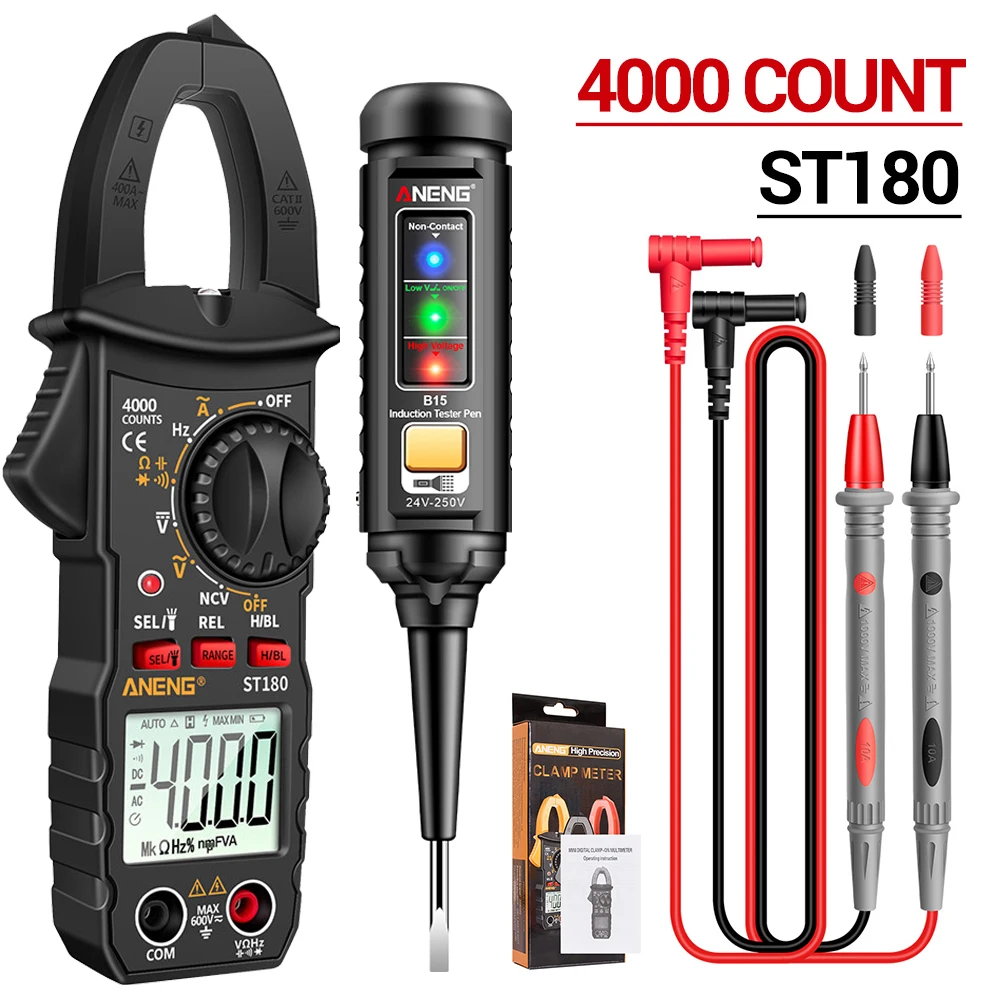 Bolígrafo probador de pinza amperimétrica ANENG ST180+B15TrajeMultímetro de 4000 recuentos, medidor detector de voltaje de 30-1000V, buscador de punto de interrupción de diagnóstico