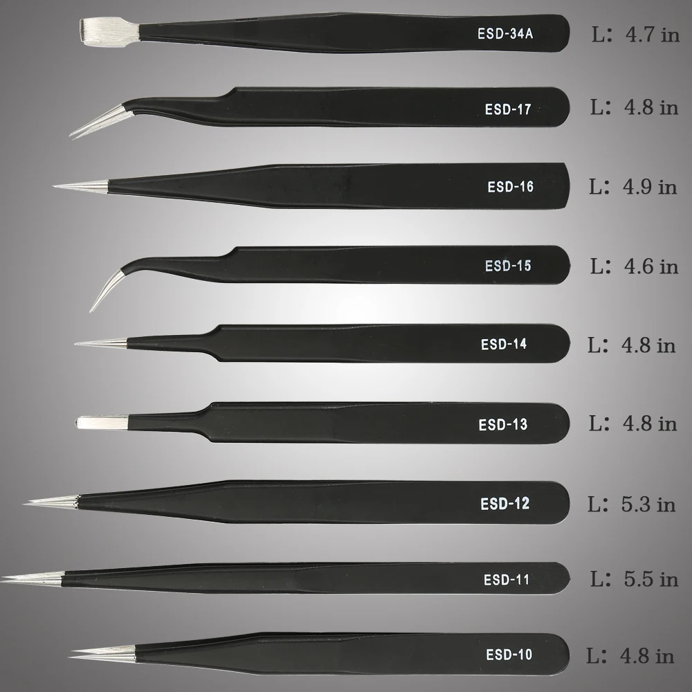 Comprar Pinzas de acero inoxidable antiestáticas ESD, herramientas de precisión Industrial, juego de pinzas rectas curvadas, 1/2/9 piezas