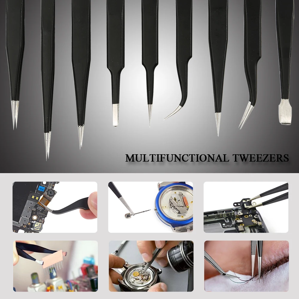 1/2/9Pcs Stainless Steel Tweezers Anti-static ESD Tweezer Tools Industrial Precision Curved Straight Tweezers Set