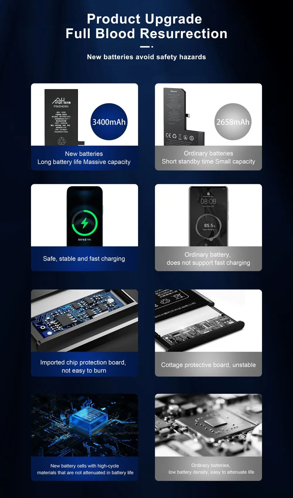 La diferencia entre capacidad estándar y alta capacidad:Las dimensiones externas son exactamente las mismas y cuanto mayor sea la capacidad, mayor será la duración del teléfono. La capacidad marcada de la batería es la capacidad real (valor de error: 50 mah), que admite pruebas.