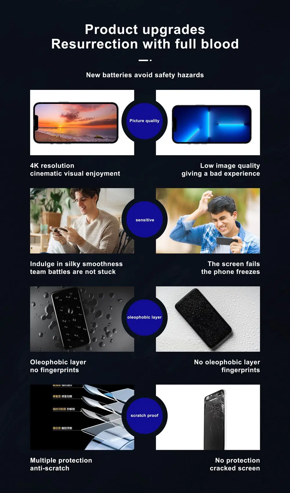 Desventajas: El precio es relativamente caro y aún no puede mostrar negro puro.La interfaz negra mostrará un color gris, pero el efecto de visualización es mejor que el OLED normal.El grosor de la pantalla solo es ligeramente más grueso que el original. Consumo de energía ligeramente mayor que el original.
