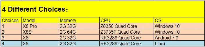 CPU: Intel Z8350 de cuatro núcleos hasta 1,92 GHz ( X8S:Z3735F de cuatro núcleos; X8:RK3288 de cuatro núcleos)