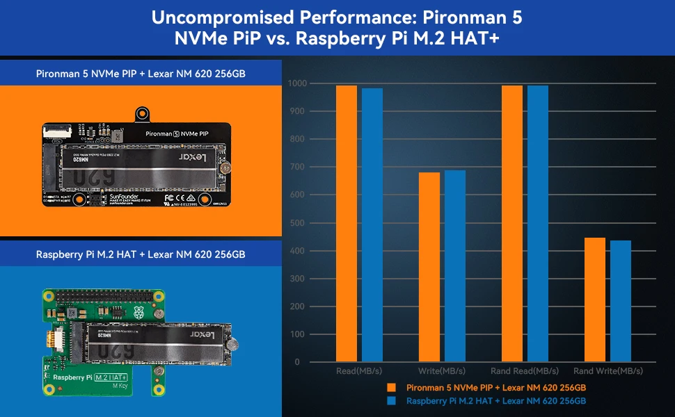 El Pironman 5 incluye el Pi5 NVMe PIP(Placa periférica PCIe), una placa adaptadora PCIe diseñada específicamente para unidades de estado sólido NVMe.Esta placa admite cuatro tamaños de SSD NVMe: 2230, 2242, 2260 y 2280, todos los cuales se pueden instalar en una ranura para llaves M.2 M.La conexión está certificada para velocidades Gen 2.0 (5 GT/seg), pero se puede forzar a Gen 3.0 (10 GT/seg) para un rendimiento más rápido.