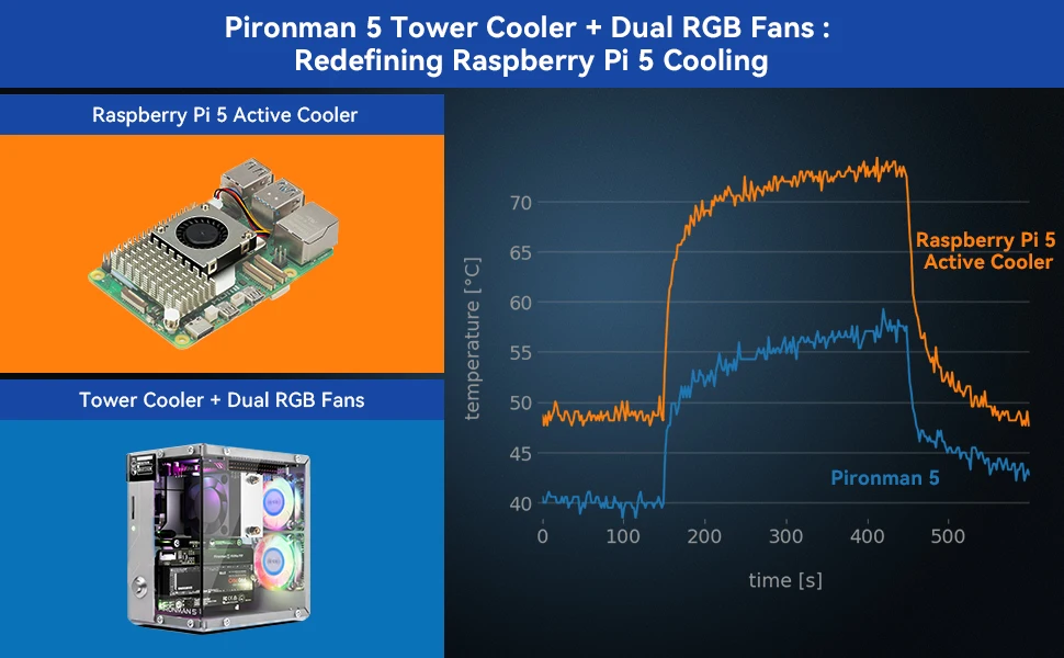 Buena calidad, proceso de montaje interesante, refrigeración impresionante. La lógica de refrigeración consta de dos refrigeradores, un refrigerador de torre con un enorme radiador y tres almohadillas térmicas. Las almohadillas térmicas son para la RAM, la CPU y la cadena de alimentación. Son capaces de enfriar fácilmente el RPI5 incluso con cargas del 100%. Después de una prueba de estrés de 360 segundos, la CPU nunca se calentó por encima de los 50 grados. Este caso es perfecto para ejecutar esxi o cualquier otro proyecto de carga pesada. Nunca dejará de mantener los componentes a salvo del sobrecalentamiento.