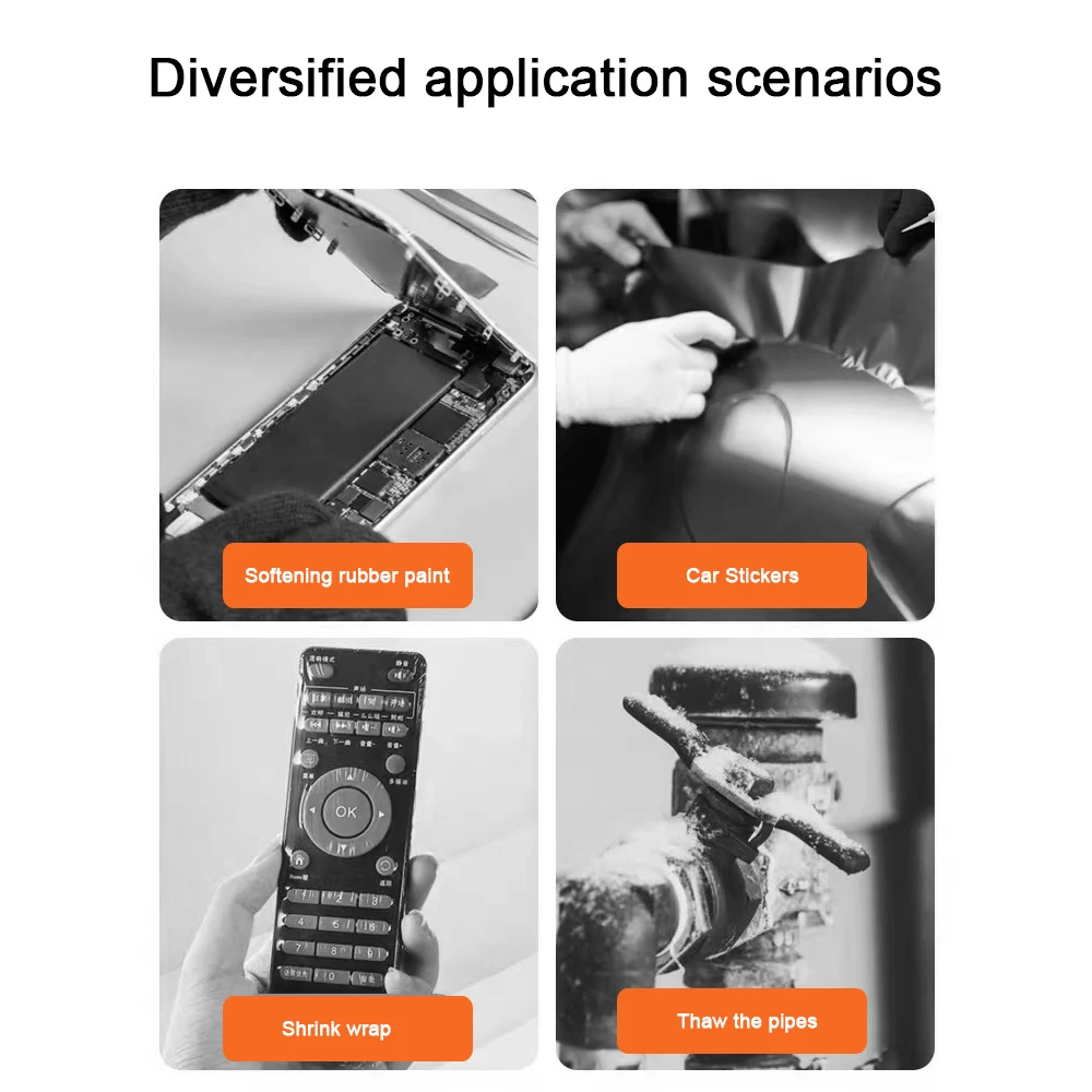 1.05 se utiliza en electricistas electrónicos, películas termorretráctiles para embalaje de productos, reparación de parachoques de automóviles, eliminación de pintura, secado y descongelación para reemplazar baldosas, doblar tubos de plástico, soplar tubos termorretráctiles, descongelar refrigeradores, extremos de hilos de fábrica de ropa, etc.