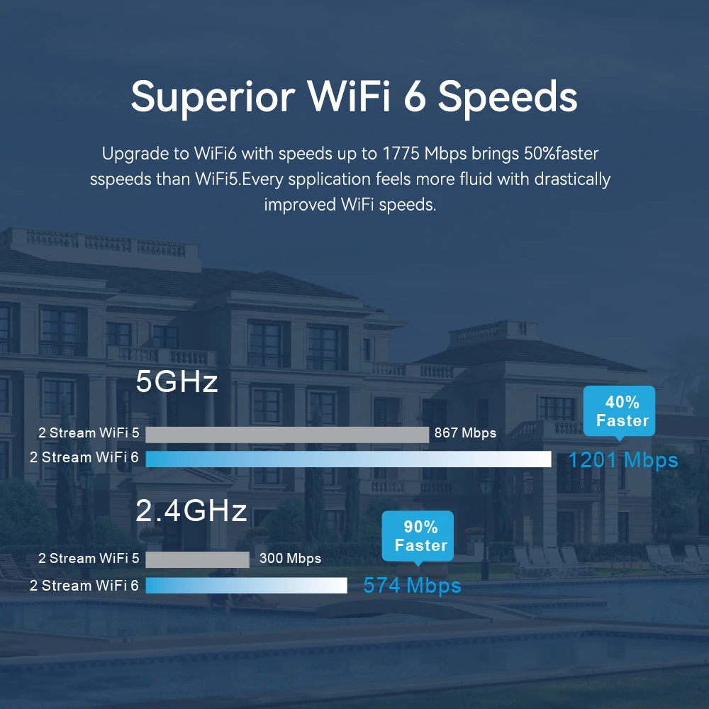 Admite concurrencia de doble banda de 2,4G\\\\\\\/5G, la banda de 2,4GHZ proporciona una velocidad de transmisión inalámbrica de 600mbps, la vinculación de 5GHZ proporciona una velocidad de transmisión inalámbrica de 1200mbps, antena polarizada dual de alta ganancia incorporada.