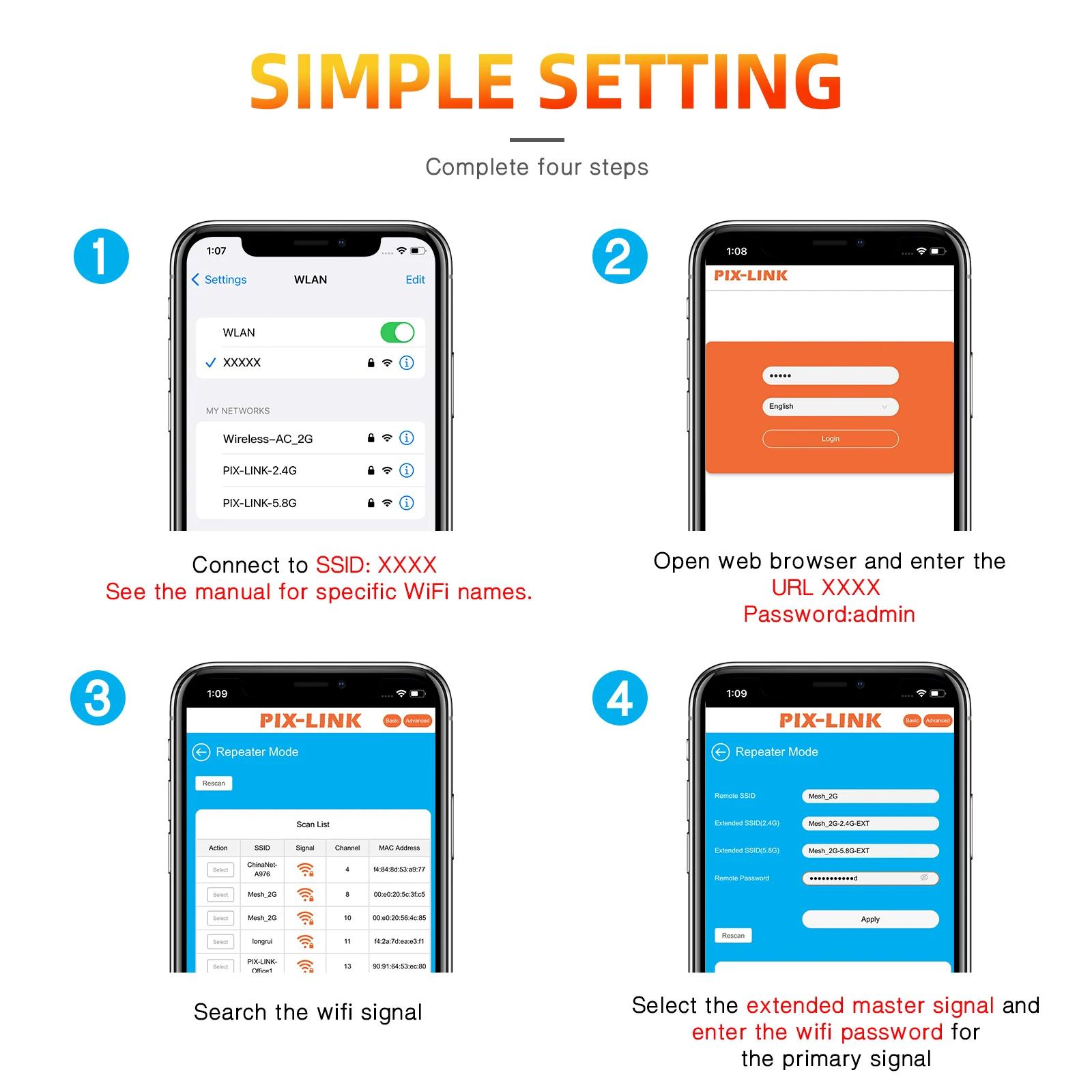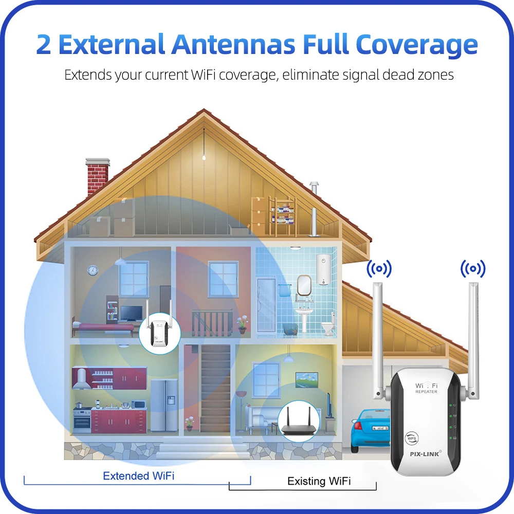 • Velocidad de transmisión Wi-Fi de 300 Mbps :Este replicador PIXLINK ofrece una velocidad de transmisión Wi-Fi de 300 Mbps, proporcionando una conexión rápida y estable para todas sus necesidades de internet en casa.