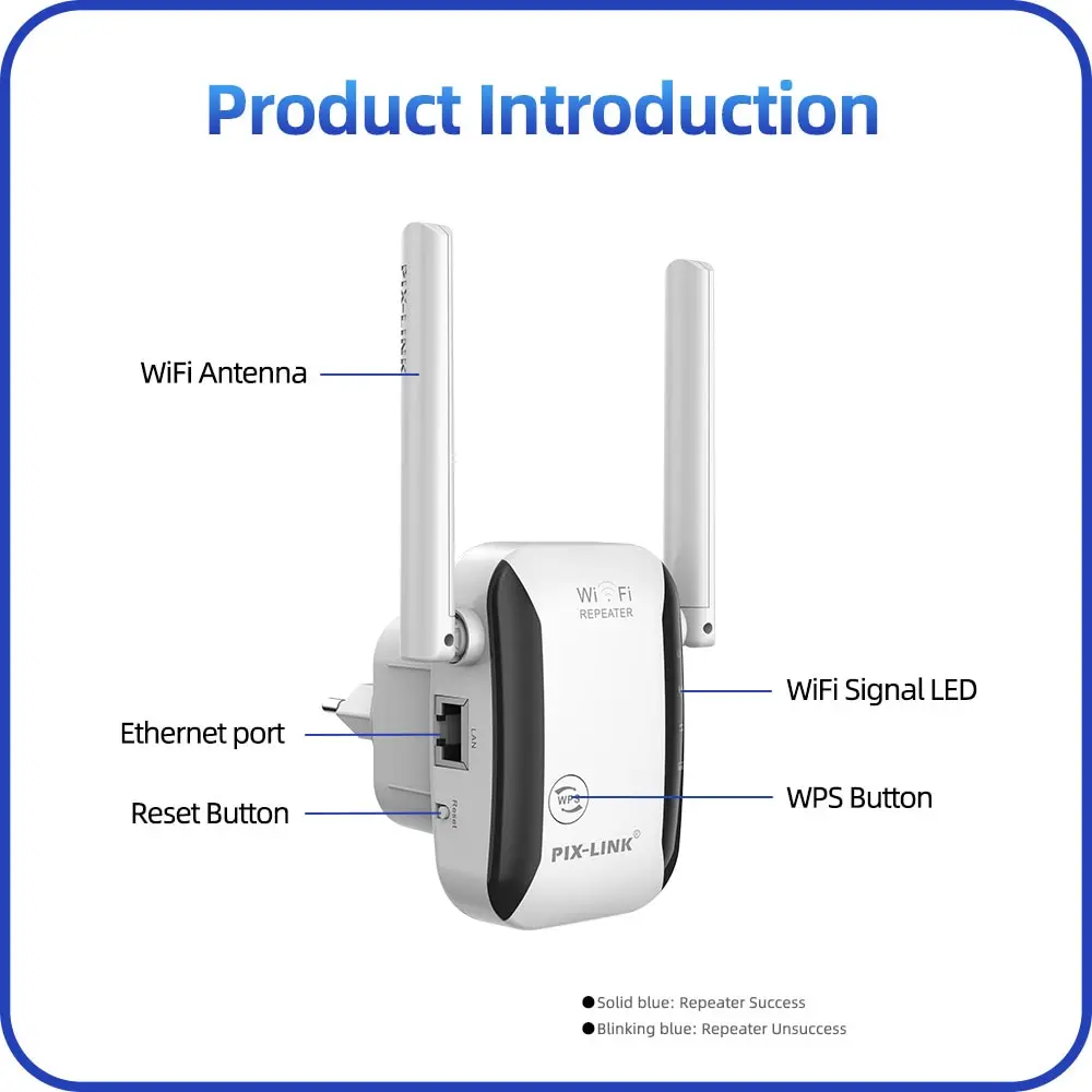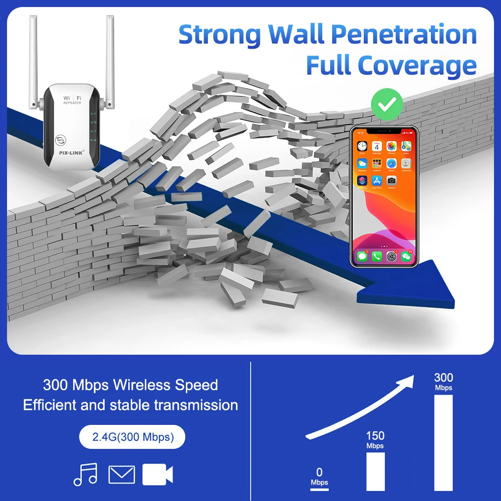 • Velocidad de transmisión Wi-Fi de 300 Mbps :Este replicador PIXLINK ofrece una velocidad de transmisión Wi-Fi de 300 Mbps, proporcionando una conexión rápida y estable para todas sus necesidades de internet en casa.