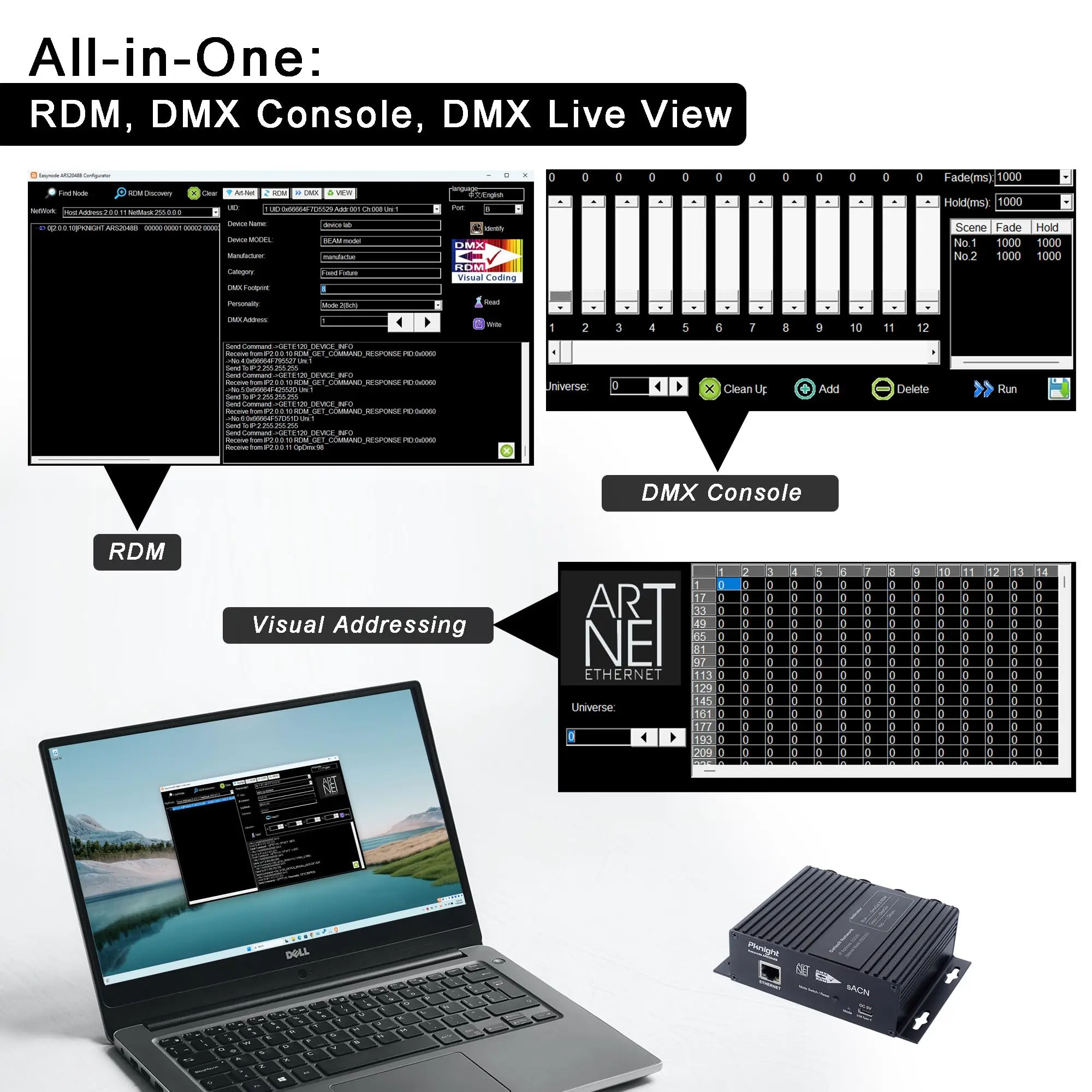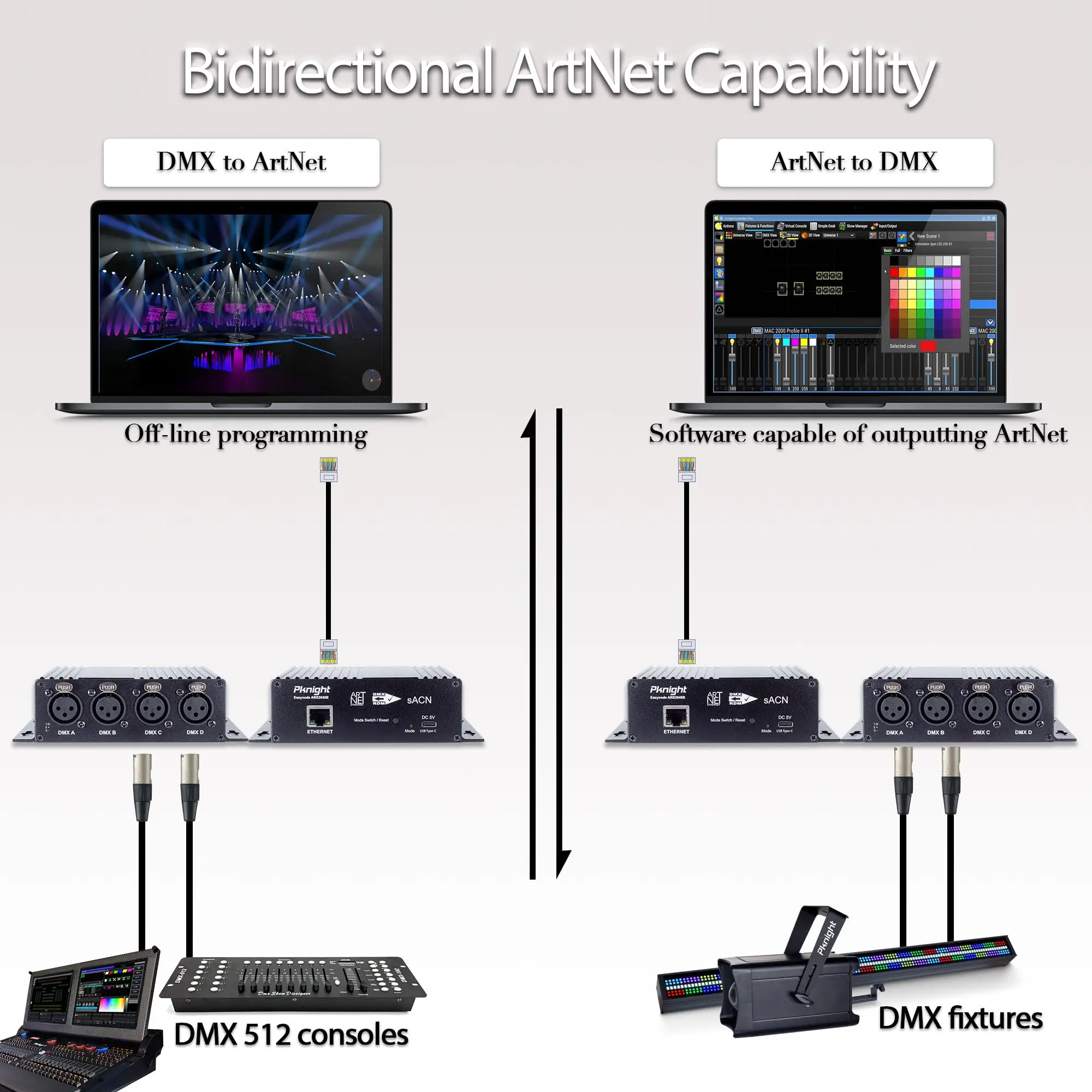 Funcionalidad de ArtNet bidireccional: El ARS2048B tiene capacidades de ArtNet bidireccionales, lo que le permite recibir y enviar señales de ArtNet para un control mejorado.