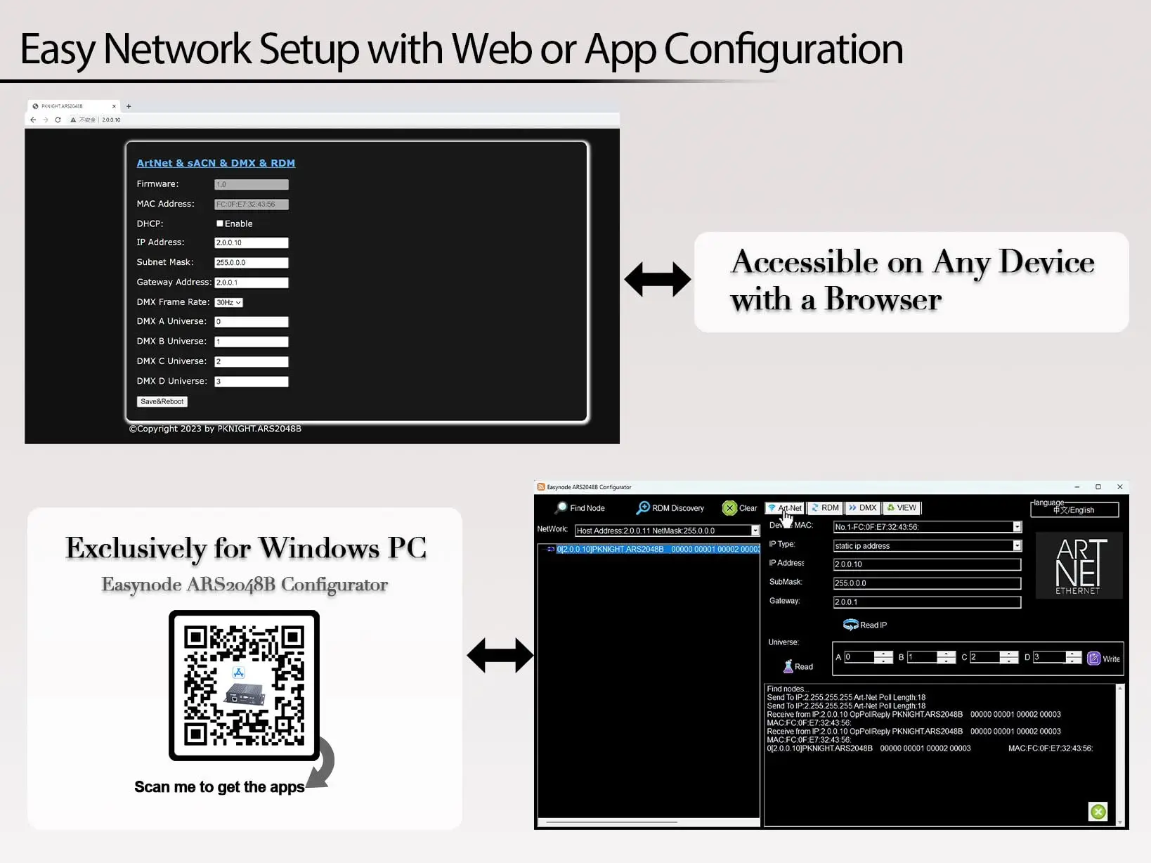 En este modo, el EasyNode ARS2048B no solo convierte las señales de red (o sACN Artnet) en señales DMX, sino que También envía señales RDM a accesorios o sistemas que admiten la funcionalidad RDM. Esta doble funcionalidad permite un control y una comunicación más avanzados con equipos de iluminación compatibles.