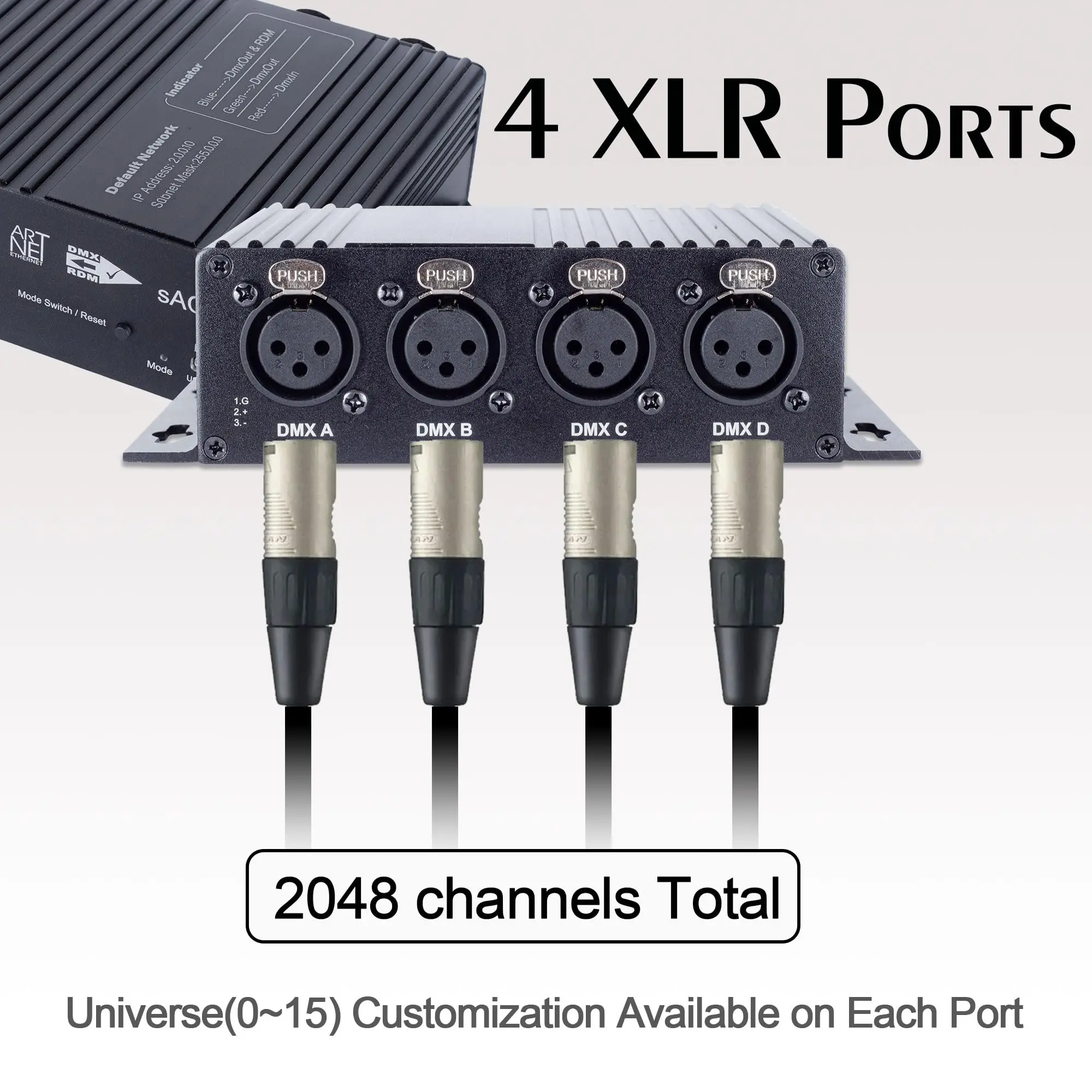 Control DMX eficiente: El dispositivo puede enviar simultáneamente a cuatro dominios DMX (2048), y los usuarios pueden asignar libremente el universo DMX a los puertos XLR, ofreciendo una forma eficiente y flexible de controlar DMX.