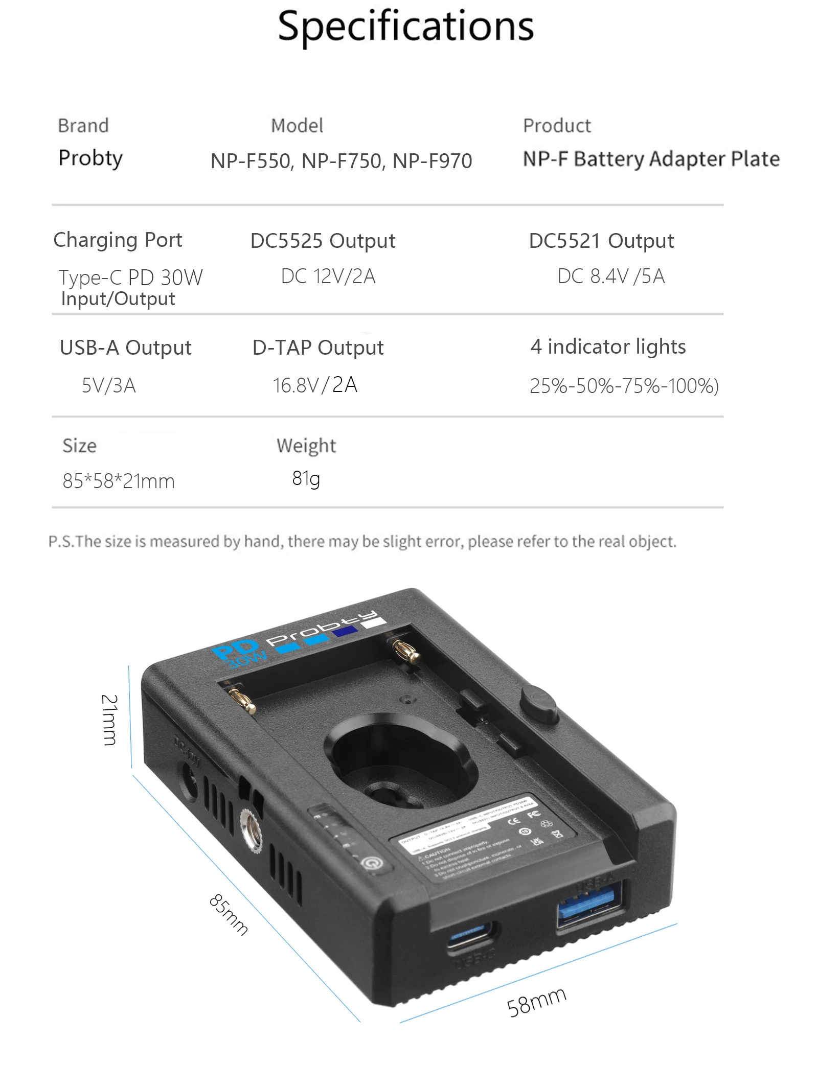 Especificaciones de la placa adaptadora del cargador de batería PD30W NP-F: