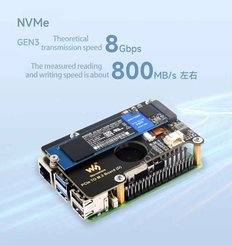 [] Compared with the Raspberry Pi's Micro SD interface, it has faster reading and writing speeds, greatly improving the reading and writing speed of the system or files, and supports NVMe SSD to boot the Raspberry Pi.