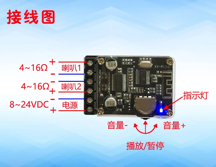 Después de encender la alimentación, la luz indicadora azul parpadea rápidamente y entra en el modo Bluetooth; Después de transmitir el "tono rápido", entra en el modo de emparejamiento esperando el emparejamiento; el teléfono móvil Bluetooth busca"XY-P15W"(Nombre del dispositivo de placa amplificadora), Haga clicXY-P15W"Conexión, después de que la conexión sea exitosa, reproduzca el" Tono de aviso ", la luz indicadora está encendida, puede reproducir música del teléfono móvil, la luz indicadora parpadea lentamente al reproducir música; después de desconectar el Bluetooth, la placa amplificadora se prepara para el siguiente par, después de reproducir el" tono rápido ", Entre en el modo de emparejamiento y espere el emparejamiento. Conectar como se muestra en la siguiente figura