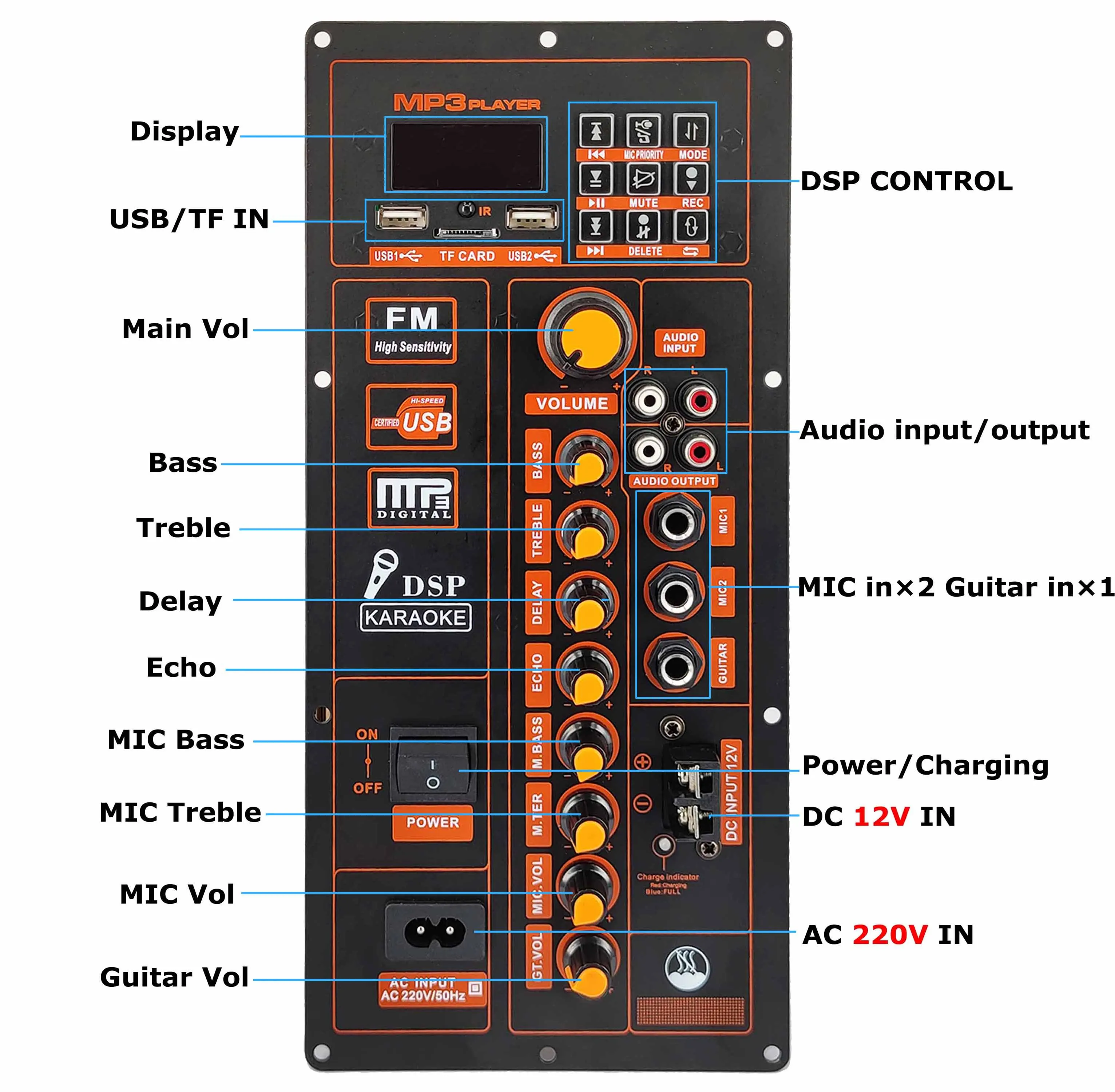 3. Reverberación de Karaoke, función de retardo, entrada de audio fuera de banda, salida de audio, con Bluetooth, con entrada de guitarra, con prioridad de micrófono, con pantalla y otras funciones.