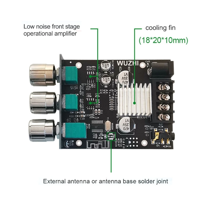 Adopta el chip TPA3116D2 (con función de supresión de interferencias AM), con excelente calidad de sonido. Asegura que incluso con un funcionamiento de alta potencia durante mucho tiempo.