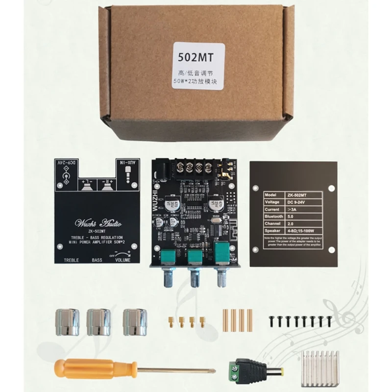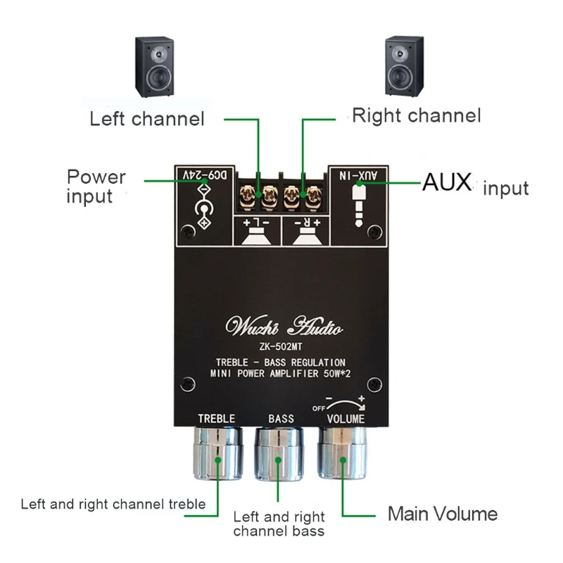 Potencia de salida estéreo de doble canal 50 vatios x 2, para rango de voltaje de trabajo de altavoces pasivos de 2A 4/8 Ω.
